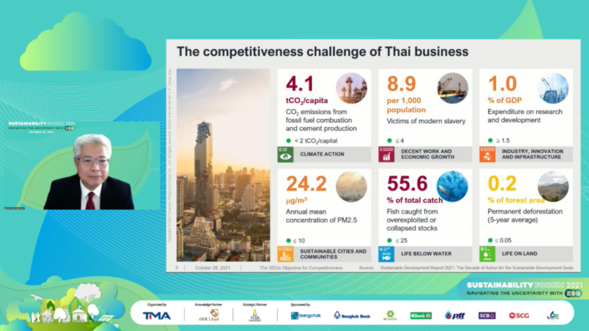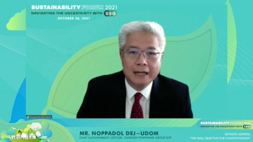 คุณนพปฎล เดชอุดม ประธานคณะผู้บริหารด้านความยั่งยืนองค์กร เครือเจริญโภคภัณฑ์ (ซีพี) กล่าวในหัวข้อ The SDGs Objective for Competitiveness ว่า การเพิ่มขีดความสามารถในการแข่งขันของประเทศ โดยนำแนวคิด ESG มาปรับใช้ในการดำเนินธุรกิจจะสร้างความได้เปรียบทางการแข่งขันได้ โดยเฉพาะการตระหนักถึงความจำเป็นที่ต้องทำความเข้าใจเรื่องธุรกิจกับการเปลี่ยนแปลงสภาพภูมิอากาศ ซึ่งถือเป็นวาระของโลกที่ทุกองค์กรต้องเร่งปรับตัวแก้ปัญหา