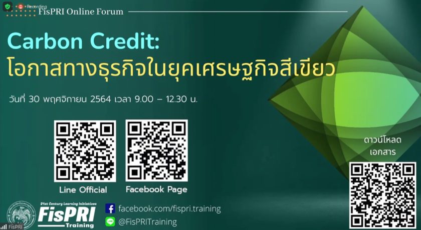30 พฤศจิกายน 2564 – มูลนิธิสถาบันวิจัยนโยบายเศรษฐกิจการคลัง จัดสัมมนาวิชาการออนไลน์ “Carbon Credit: โอกาสทางธุรกิจในยุคเศรษฐกิจสีเขียว” เพื่อเตรียมความพร้อมผู้ประกอบการในการดำเนินธุรกิจที่เข้าสู่สังคมคาร์บอนต่ำ รวมไปถึงมุมมองด้านการศึกษาความเสี่ยง และความท้าทายที่อาจเกิดขึ้นต่อกลุ่มธุรกิจที่กำลังขับเคลื่อนสู่ยุคเศรษฐกิจสีเขียว