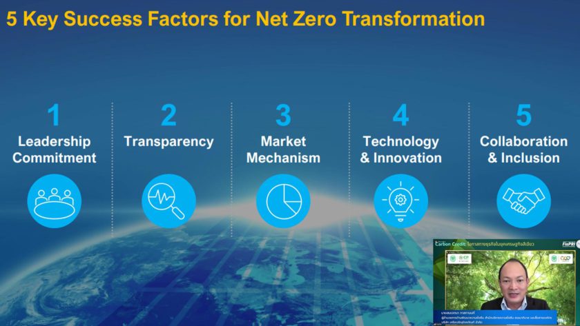 ทั้งนี้ เครือซีพีได้วางปัจจัยแห่งความสำเร็จ หรือ Key Success Factors ในการพลิกโฉมนำองค์กรสู่ Net Zero ใน 5 ประเด็นที่สำคัญ ดังนี้ 1. ผู้นำมีส่วนสำคัญในการกำหนดเป้าหมายและนโยบายที่ชัดเจนในการสะท้อนความมุ่งมั่นที่จะดำเนินการลดการปล่อยก๊าซเรือนกระจก 2.ต้องมีการประเมินวัดผล ติดตามการดำเนินงาน และต้องเปิดเผยผลการประเมินทุกปี 3. อาศัยกลไกตลาด มีการวิเคราะห์ต้นทุนและเทคโนโลยีที่เหมาะสม 4.เทคโนโลยีและนวัตกรรมเป็นเรื่องสำคัญอย่างยิ่งที่ทุกกลุ่มธุรกิจต้องปรับตัวและนำมาพัฒนาองค์กรร่วมกับคู่ค้า เกษตรกร และผู้มีส่วนได้เสีย เพื่อส่งเสริมให้เกิดการลดก๊าซเรือนกระจกอย่างต่อเนื่อง และ 5. ต้องสร้างความร่วมมือกับทุกภาคส่วนในการนำสู่สังคมคาร์บอนต่ำ เพราะเป็นเรื่องสำคัญที่ทุกคนต้องร่วมกันสร้างการเปลี่ยนแปลงให้เกิดขึ้นในโลกใบนี้