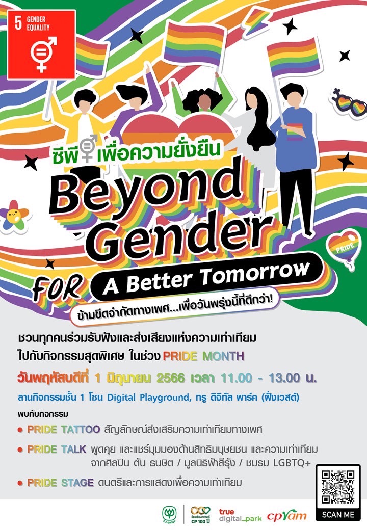 รวมพลังชาวซีพี ส่งเสียงแห่งความเท่าเทียมกับกิจกรรม Beyond Gender For A Better Tomorrow ข้ามขีดจำกัดทางเพศ…เพื่อวันพรุ่งนี้ที่ดีกว่าวันพฤหัสบดีที่ 1 มิถุนายน 2566 เวลา 11:00 – 13:00 น.