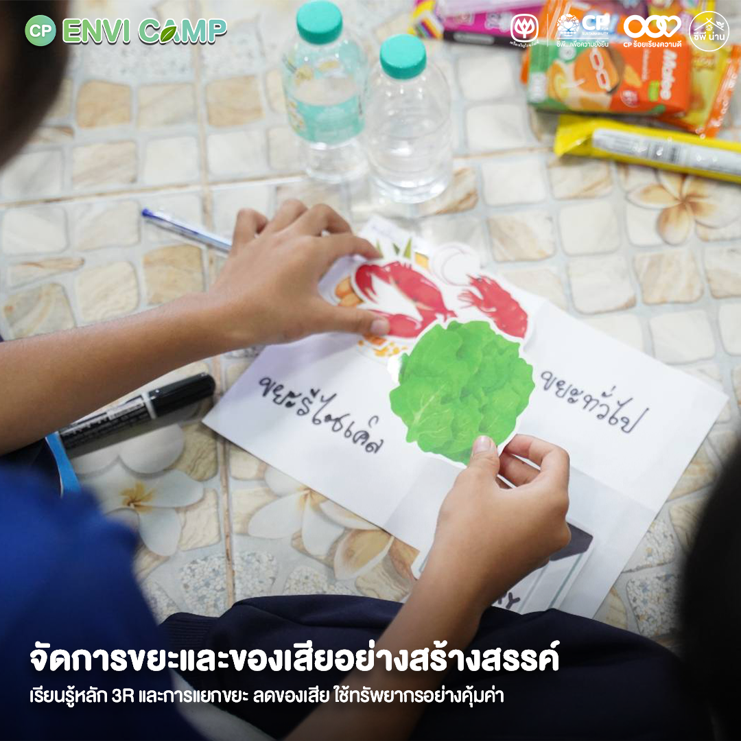 ในส่วนของการจัดการขยะและของเสีย ซีพีและซีพี แอ็กซ์ตร้า ได้ร่วมถ่ายทอดแนวคิดการจัดการขยะอย่างยั่งยืนตามหลัก 3R – Reduce, Reuse, Recycle และการแยกขยะ 4 ประเภท เด็กๆ ได้เรียนรู้ตั้งแต่ขั้นตอนการลดการใช้ทรัพยากร การคัดแยกขยะอย่างถูกต้อง ไปจนถึงการนำกลับมาใช้ประโยชน์ใหม่ พร้อมทั้งได้รับฟังตัวอย่างการจัดการของเสียในระบบห้างค้าปลีก เพื่อเห็นภาพการนำแนวคิดสิ่งแวดล้อมไปปรับใช้ในโลกของธุรกิจจริง