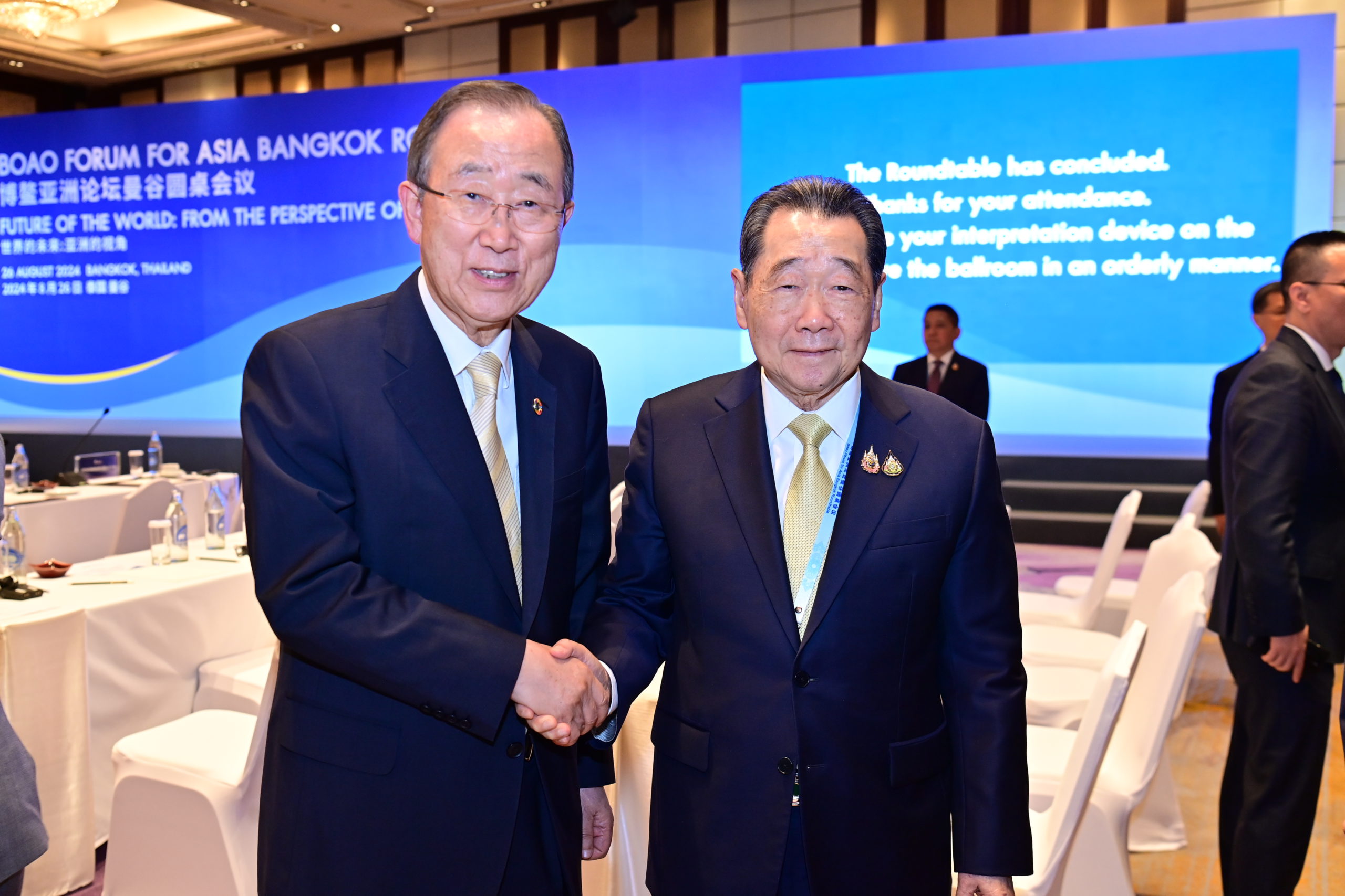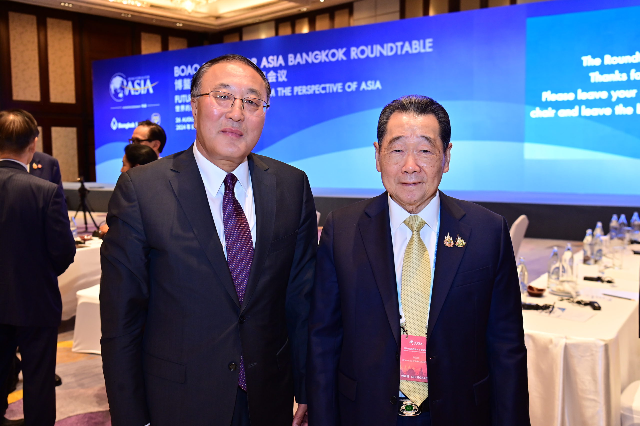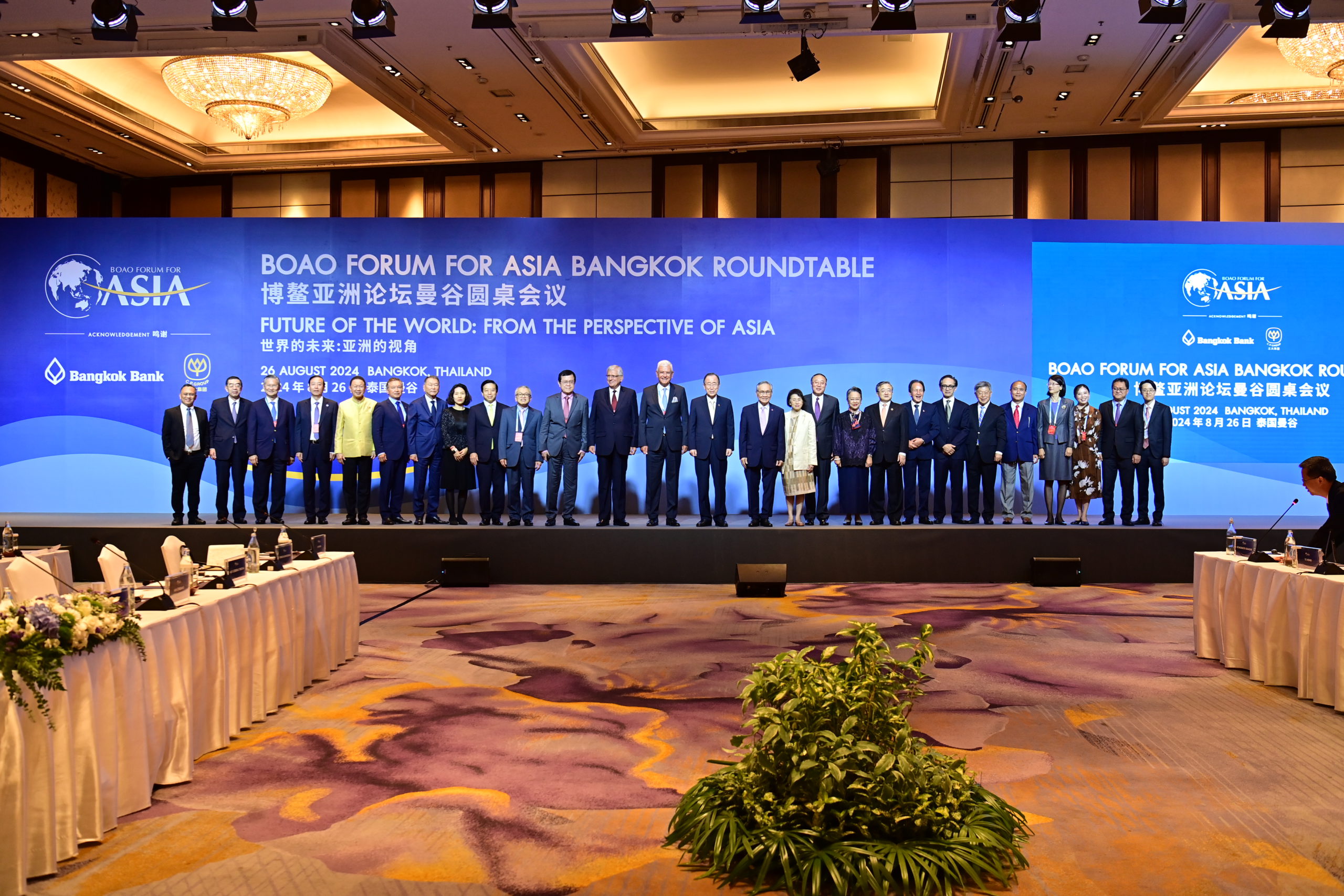 เมื่อวันที่ 26 สิงหาคม 2567 โรงแรมแชงกรี-ลา กรุงเทพฯ : จีนและพันธมิตร 26 ประเทศ จัดประชุม Boao Forum for Asia (BFA) Bangkok Roundtable ที่ประเทศไทย ถือเป็นการจัดประชุมครั้งแรกนอกประเทศสาธารณรัฐประชาชนจีน โดยจัดขึ้นภายใต้หัวข้อ “Future of the World: from the Perspective of Asia” หรือ “อนาคตของโลก: มุมมองจากเอเชีย” เพื่อเป็นเวทีแลกเปลี่ยนข้อคิดเห็นในการผนึกกำลังและการพัฒนาร่วมกันมากระหว่างประเทศต่าง ๆ ในภูมิภาคเอเชีย การประชุมครั้งสำคัญนี้มีนายหาน จื้อเฉียง เอกอัครราชทูตสาธารณรัฐประชาชนจีนประจำประเทศไทย กล่าวเปิดงานด้วยการอ่านสารแสดงความยินดีจากท่าน หวัง อี้ มนตรีแห่งรัฐและรัฐมนตรีว่าการกระทรวงการต่างประเทศของจีน พร้อมด้วยนายบัน คีมูน ประธาน BFA และอดีตเลขาธิการสหประชาชาติ นายจาง จุน เลขาธิการ BFA คุณดอน ปรมัตถ์วินัย อดีตรองนายกรัฐมนตรีและอดีตรัฐมนตรีว่าการกระทรวงการต่างประเทศของไทย พร้อมทั้งผู้นำระดับสูงจากภาครัฐ ภาคเอกชน และนักวิชาการ ที่มีบทบาทสำคัญในการขับเคลื่อนเศรษฐกิจจากหลายประเทศในภูมิภาคเอเชียรวมถึงประเทศไทยเข้าร่วมแลกเปลี่ยนความเห็นอย่างคับคั่ง ในการเร่งหาทางออกและโอกาสในการพัฒนาเศรษฐกิจและสังคมในภูมิภาครับความท้าทายโลก สำหรับบุคคลสำคัญจากประเทศไทยที่ได้รับเชิญร่วมเวทีแลกเปลี่ยนความเห็นครั้งสำคัญนี้มีอาทิ คุณสุรเกียรติ์ เสถียรไทย สมาชิกสภาที่ปรึกษาของ BFA อดีตรองนายกรัฐมนตรีและรัฐมนตรีว่าการกระทรวงการต่างประเทศของไทย ประธานอาวุโส ธนินท์ เจียรวนนท์ เครือเจริญโภคภัณฑ์ คุณชาติศิริ โสภณพนิช กรรมการผู้จัดการใหญ่ ธนาคารกรุงเทพ คุณสนั่น อังอุบลกุล ประธานสภาหอการแห่งประเทศไทย ดร.อาร์ม ตั้งนิรันดร รองคณบดีคณะนิติศาสตร์ และผู้อำนวยการศูนย์ศึกษาจีน จุฬาลงกรณ์มหาวิทยาลัย ฯลฯ ส่วนบุคคลสำคัญในต่างประเทศที่เข้าร่วมเวที BFA ที่ประเทศไทยมี อาทิ คุณโวลคาน บอซเคียร์ อดีตประธานสมัชชาใหญ่แห่งสหประชาชาติ สมัยที่ 75 คุณมาร์ตี้ นาตาเลกาวา อดีตรัฐมนตรีว่าการกระทรวงการต่างประเทศของอินโดนีเซีย คุณออง ที เกียต อดีตรองประธานสภาผู้แทนราษฎร รัฐสภาของมาเลเซีย และ คุณโบลัต นูร์กาลีเยฟ ประธานคณะกรรมการ สถาบันวิจัยนโยบายต่างประเทศ กระทรวงการต่างประเทศของสาธารณรัฐคาซัคสถาน เป็นต้น