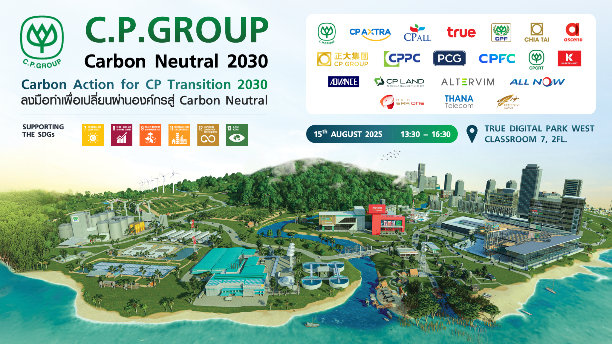 เครือเจริญโภคภัณฑ์ ตอกย้ำความมุ่งมั่นในฐานะผู้นำองค์กรด้านความยั่งยืนมุ่งแก้ไขปัญหาการเปลี่ยนแปลงสภาพภูมิอากาศและผลกระทบที่เกิดขึ้น (Climate Action) ตามดำริของคุณศุภชัย เจียรวนนท์ ประธานคณะผู้บริหาร เครือซีพี ที่เน้นย้ำให้ทุกภาคส่วนในเครือร่วมมือกันอย่างเร่งด่วน กำหนดกลยุทธ์และแผนปฏิบัติร่วมกัน เพื่อเดินหน้าสู่เป้าหมาย “ความเป็นกลางทางคาร์บอน” ภายในปี 2573 จึงเกิดเป็นการประชุมเชิงปฏิบัติการ “C.P.GROUP Carbon Neutral 2030 Carbon Action for CP Transition 2030 ลงมือทำเพื่อเปลี่ยนผ่านองค์กรสู่ Carbon Neutral” ในวันพฤหัสบดีที่ 15 สิงหาคม 2568 เวลา 13.30 – 16.30 น. ณ ห้อง Training 7, True Digital Park (TDPK) ฝั่ง West โดยมีผู้บริหารและผู้แทนจากทุกกลุ่มธุรกิจในเครือฯ พร้อมผู้ทรงคุณวุฒิที่ตอบรับเข้าร่วม ร่วมระดมความคิดเห็น เสริมข้อเสนอเชิงปฏิบัติ และแลกเปลี่ยนประสบการณ์กับผู้เชี่ยวชาญด้านสิ่งแวดล้อมและพลังงานสะอาด ได้แก่