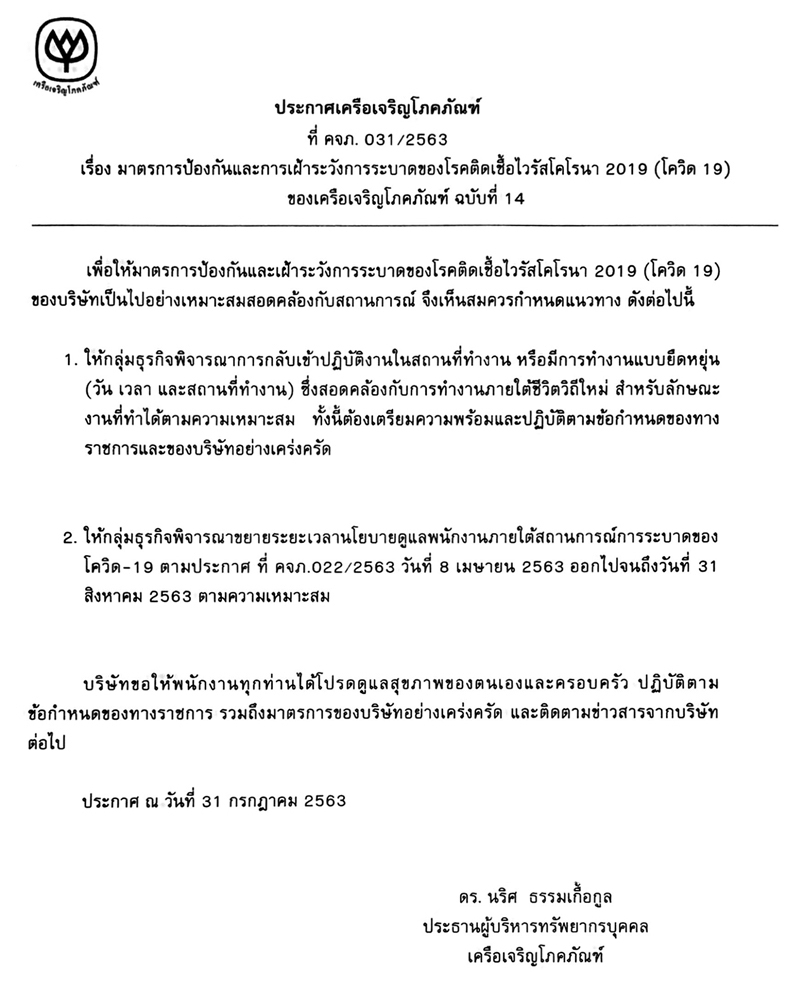 เพื่อให้มาตรการป้องกันและเฝ้าระวังการระบาดของโรคติดเชื้อไวรัสโคโรนา 2019 (โควิด-19) ของบริษัทเป็นไปอย่างเหมาะสมตามสถานการณ์ เครือฯจึงประกาศมาตรการป้องกันฯ ฉบับที่ 14 เรื่องให้กลุ่มธุรกิจพิจารณาการกลับเข้าปฏิบัติงานในสถานที่ทำงานและการขยายเวลานโยบายดูแลพนักงานภายใต้สถานการณ์การระบาดของโควิด-19 ตามประกาศนี้