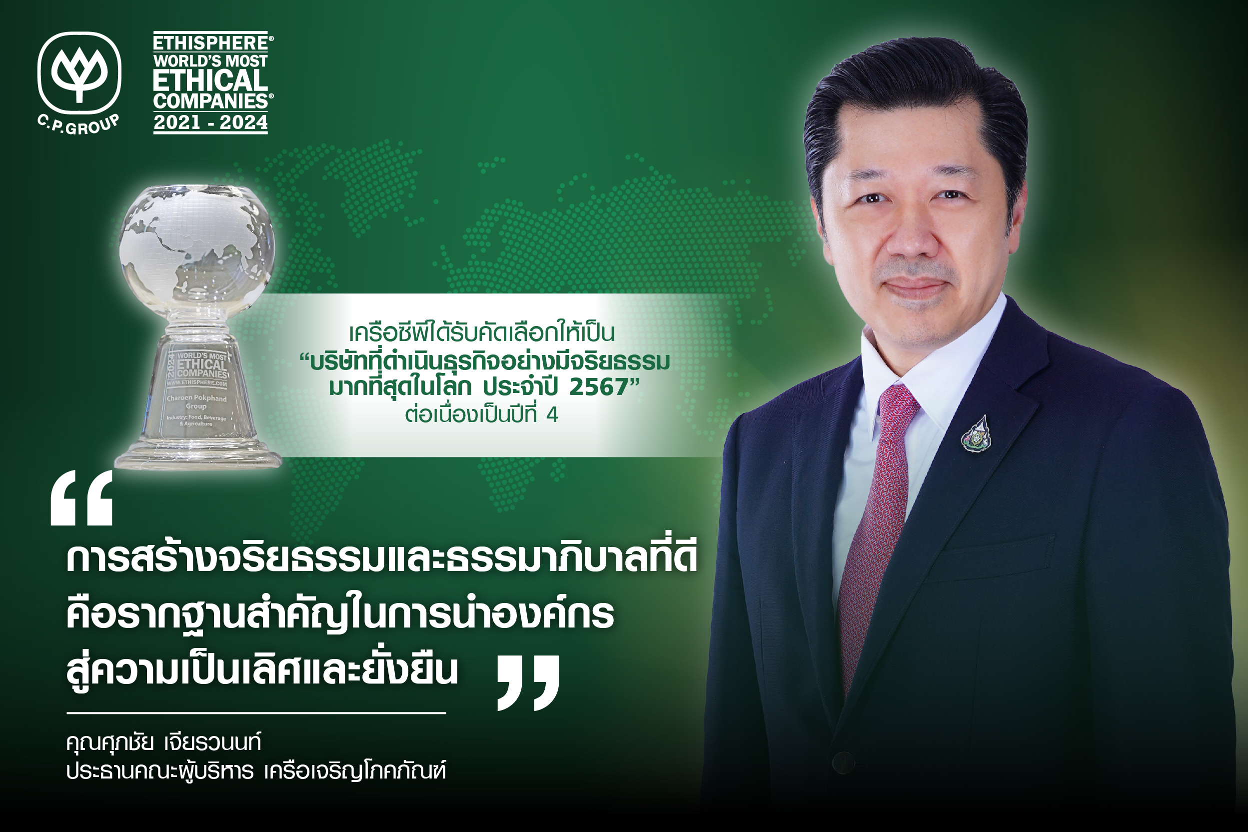 7 มีนาคม 2567 : Ethisphere สถาบันชั้นนำระดับโลกด้านการวัดและประเมินมาตรฐานจริยธรรมในการดำเนินธุรกิจ ประกาศผลการพิจารณา “บริษัทที่มีจริยธรรมมากที่สุดในโลกประจำปี 2567” (The 2024 World’s Most Ethical Companies) โดยในปีนี้มีบริษัทชั้นนำจาก 20 ประเทศทั่วโลกผ่านการคัดเลือกรวมทั้งสิ้น 136 บริษัท โดย บริษัท เครือเจริญโภคภัณฑ์ จำกัด หรือ เครือซีพี จากประเทศไทยได้รับการพิจารณาคัดเลือกให้เป็นบริษัทที่มีจริยธรรมมากที่สุดในโลก ประจำปี 2567 ต่อเนื่องเป็นปีที่ 4 โดยในปีนี้ถือเป็นการประเมินบริษัทที่มีจริยธรรมมากที่สุดในโลกครั้งที่ 18 นอกจากเครือซีพีแล้วมีบริษัทชั้นนำระดับโลกได้รับพิจารณาว่ามีจริยธรรมมากที่สุด อาทิ PepsiCo จากสหรัฐอเมริกา Sony จากญี่ปุ่น Kellanova (Kellogg) จากสหรัฐอเมริกา Hershey’s จากสหรัฐอเมริกา L’ORÉAL จากฝรั่งเศส IBM จากสหรัฐอเมริกา Allianz Life จากสหรัฐอเมริกา Kao Corporation จากญี่ปุ่น MasterCard จากสหรัฐอเมริกา และ ManpowerGroup Inc.จากสหรัฐอเมริกา เป็นต้น ทั้งนี้ข้อมูลของ Ethisphere ระบุว่า การดำเนินธุรกิจอย่างมีจริยธรรมสร้างผลกระทบเชิงบวกและเสริมประสิทธิภาพเหนือกว่าคู่แข่งถึง 12.3% ขณะที่ซีอีโอ เครือซีพี เชื่อมั่นคุณธรรมความซื่อสัตย์สร้างธุรกิจเติบโตยั่งยืน