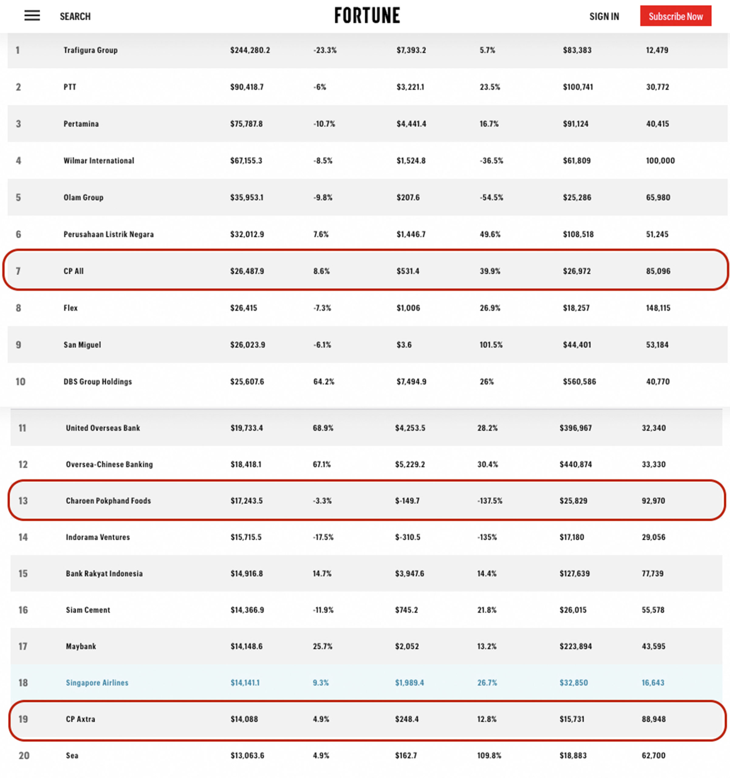 เมื่อวันที่ 18 มิถุนายน 2567 นิตยสาร Fortune ประกาศผล Fortune Southeast Asia 500 การจัดอันดับบริษัทขนาดใหญ่ที่สุดในเอเชียตะวันออกเฉียงใต้ โดยมี 3 บริษัทหลักในเครือเจริญโภคภัณฑ์ ติด 20 อันดับแรก ซึ่งเป็นการจัดอันดับบริษัทที่ประสบความสำเร็จทางธุรกิจมากที่สุดในภูมิภาคอาเซียน โดยพิจารณารายได้และกำไรจากปีงบประมาณ 2566 ได้แก่ บริษัท ซีพี ออลล์ จํากัด (มหาชน) ได้รับการจัดอันดับอยู่ในลำดับที่ 7 บริษัท เจริญโภคภัณฑ์อาหาร จำกัด (มหาชน) ได้รับการจัดอันดับอยู่ในลำดับที่ 13 และ บริษัท ซีพี แอ็กซ์ตร้า จำกัด (มหาชน) ได้รับการจัดอันดับอยู่ในลำดับที่ 19