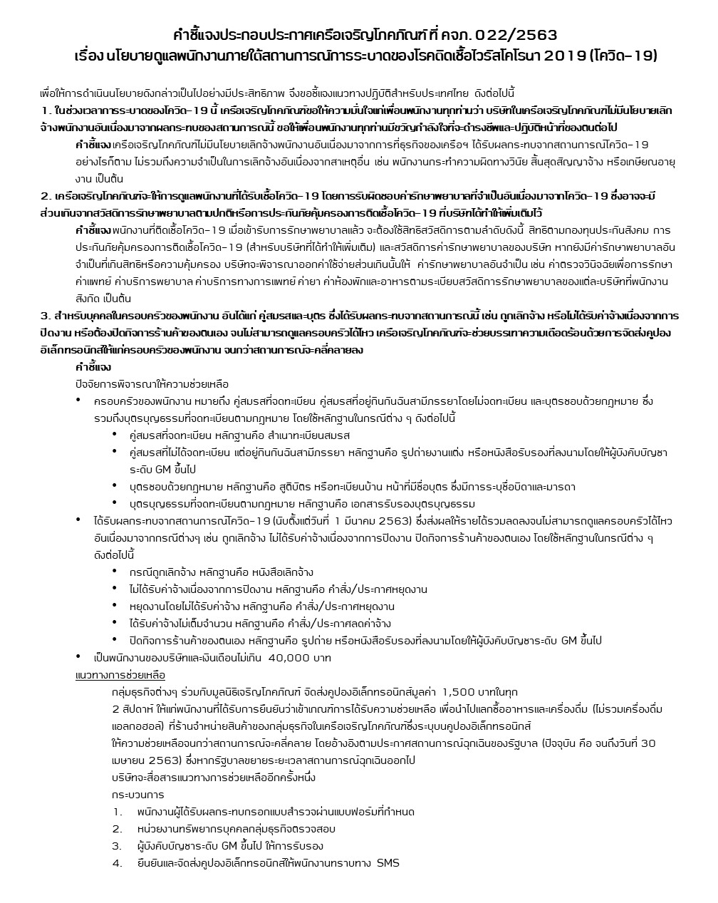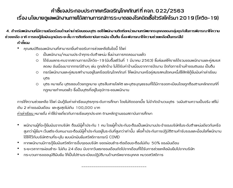 1) บริษัทไม่มีนโยบายเลิกจ้างพนักงานอันเนื่องจากเหตุการณ์แพร่ระบาดของโรคนี้