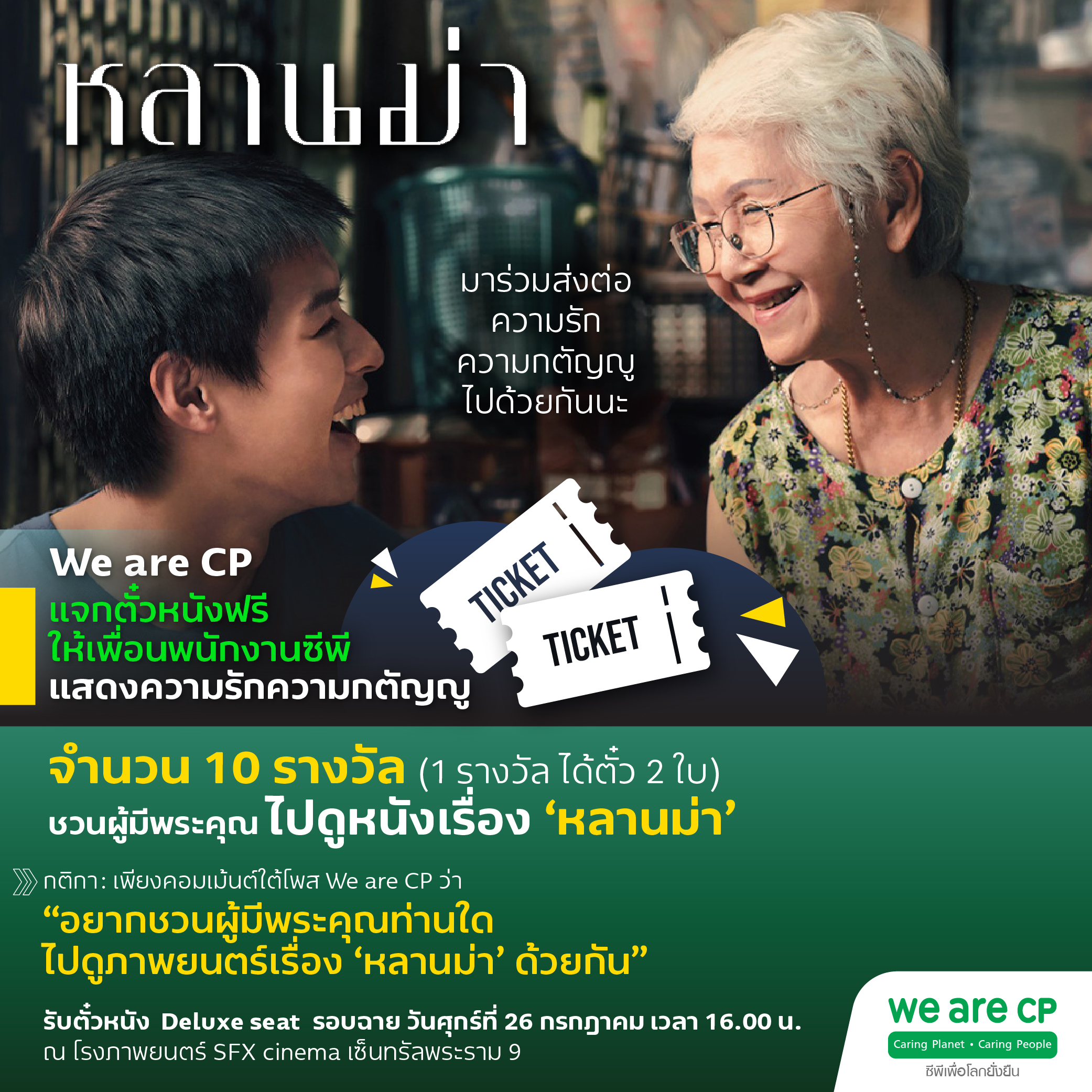 ❤️🎞 We are CP แจกตั๋วหนังฟรีให้เพื่อนพนักงานซีพี แสดงความรักความกตัญญู ชวนพ่อแม่หรือผู้มีพระคุณไปดูหนังเรื่อง ‘หลานม่า’ จำนวน 10 รางวัล 🎞❤️