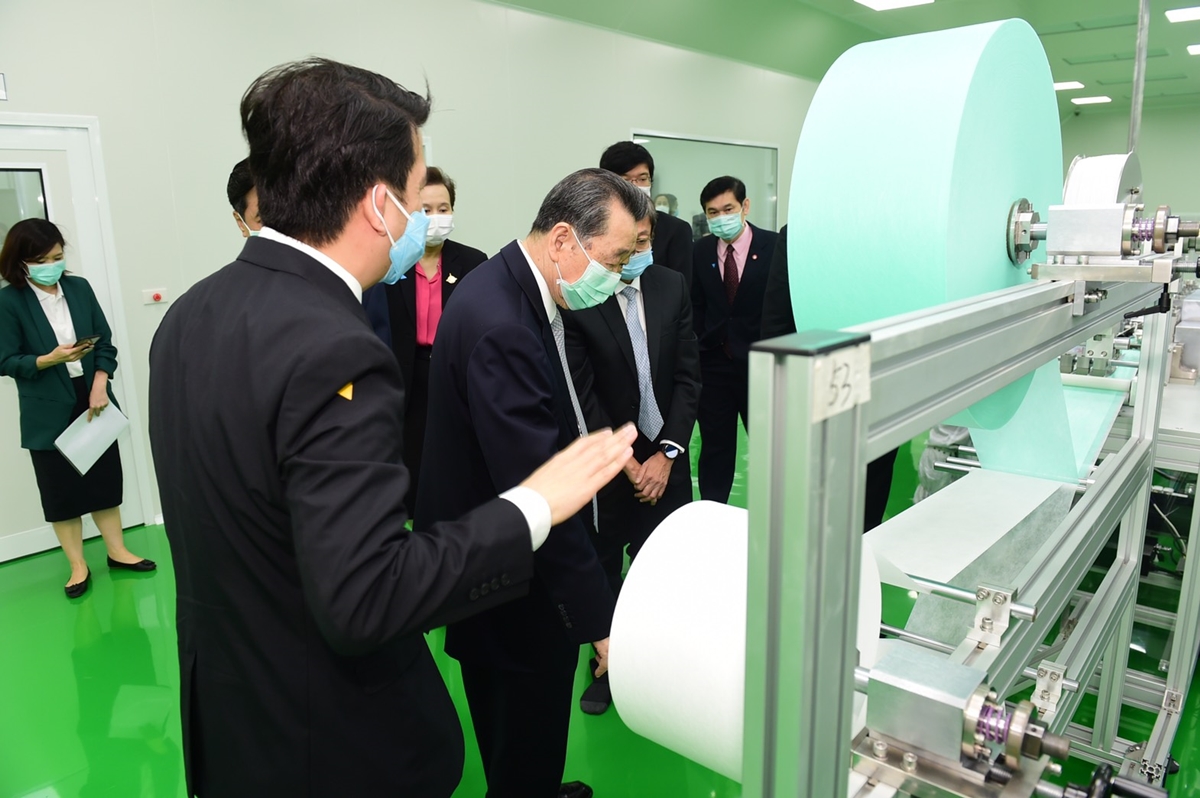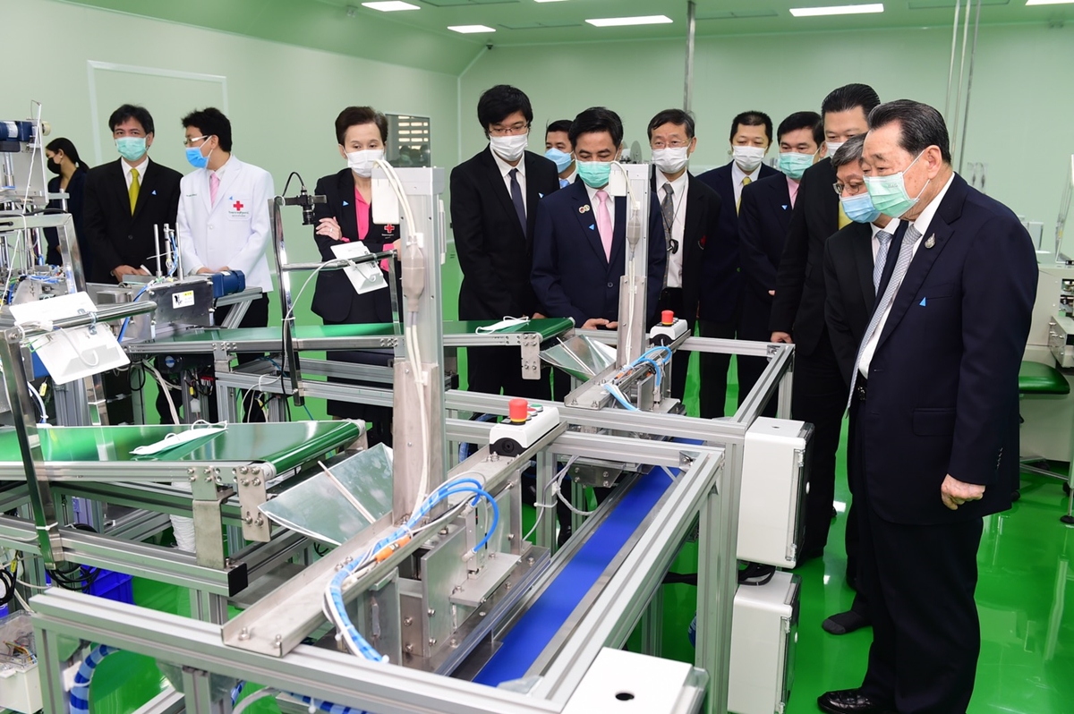 ประธานอาวุโส ธนินท์ เจียรวนนท์ เปิดเผยว่า รู้สึกยินดีและมีความสุขมากที่เครือซีพีสามารถสร้างโรงงานผลิตหน้ากากอนามัยเพื่อแจกฟรีให้แก่แพทย์ พยาบาล บุคลากรทางการแพทย์ตลอดจนประชาชนได้ภายในเวลา 5 สัปดาห์ ซีพีเห็นความสำคัญว่าสถานการณ์ขณะนี้ต้องเร่งปกป้องแพทย์และบุคลากรทางการแพทย์ทั่วประเทศไม่ให้ติดเชื้อโควิด-19 เพื่อให้กลุ่มคนเหล่านี้มีพลังที่จะปกป้องประชาชน ดังนั้นจึงสำคัญมากที่ต้องผลิตหน้ากากอนามัยแจกจ่ายให้ทุกโรงพยาบาลทั่วประเทศ โดยโรงพยาบาลจุฬาลงกรณ์ฯ สภากาชาดไทย จะเป็นองค์กรที่ดูแลแจกจ่ายหน้ากากอนามัยส่งต่อไปยังทุกโรงพยาบาลในประเทศ และส่วนที่เหลือจึงแจกจ่ายให้ประชาชนทั่วไปฟรี โดยกำลังการผลิตปัจจุบันตั้งเป้าไว้ที่วันละ 1 แสนชิ้น หรือ 3 ล้านชิ้นต่อเดือน โดยโรงงานนี้เป็นโรงงานอัตโนมัติใช้ผู้ควบคุมในโรงงานเพียง 3 คน เพื่อให้เป็นโรงงานที่ปลอดเชื้อโรคสูงสุด สามารถผลิตได้ตลอด 24 ชั่วโมง