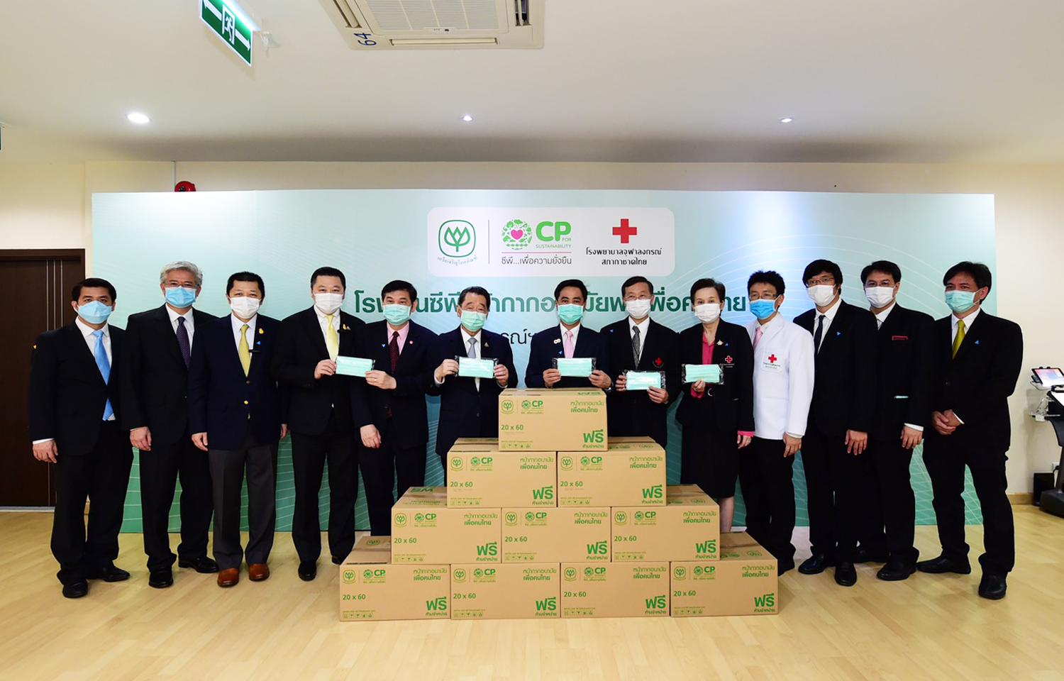 16 เมษายน 2563 – คุณธนินท์ เจียรวนนท์ ประธานอาวุโส เครือเจริญโภคภัณฑ์ พร้อมด้วย ศ.นพ.สุทธิพงศ์ วัชรสินธุ ผู้อำนวยการโรงพยาบาลจุฬาลงกรณ์ สภากาชาดไทย ศ.นพ.วิชัย เบญจชลมาศ ผู้อำนวยการศูนย์โรคหัวใจ รพ.จุฬาลงกรณ์ฯ คุณสุภกิต เจียรวนนท์ ประธานกรรมการ เครือฯ คุณศุภชัย เจียรวนนท์ ประธานคณะผู้บริหาร เครือฯ พร้อมคณะแพทย์ รพ.จุฬาลงกรณ์ฯ และผู้บริหารเครือซีพี เข้าเยี่ยมชม “โรงงานซีพีหน้ากากอนามัยฟรีเพื่อคนไทย” ที่ อ.พระประแดง จ.สมุทรปราการ ซึ่งเปิดสายการผลิตหน้ากากอนามัยเป็นวันแรก และเครือซีพีได้ส่งมอบหน้ากากอนามัยจำนวน 100,000 ชิ้นแรก ให้แก่ รพ.จุฬาลงกรณ์ฯ เป็นที่เรียบร้อยแล้ว