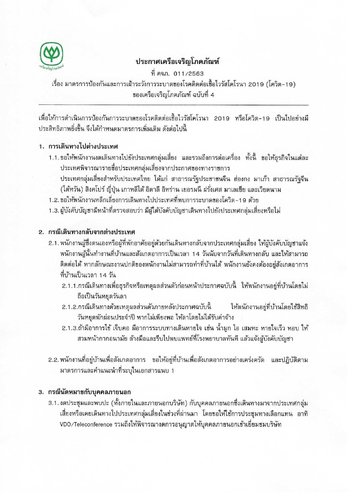 เครือซีพีประกาศมาตรการป้องกันและเฝ้าระวังการระบาดของเชื้อไวรัสโควิด-19 ฉบับที่ 4
