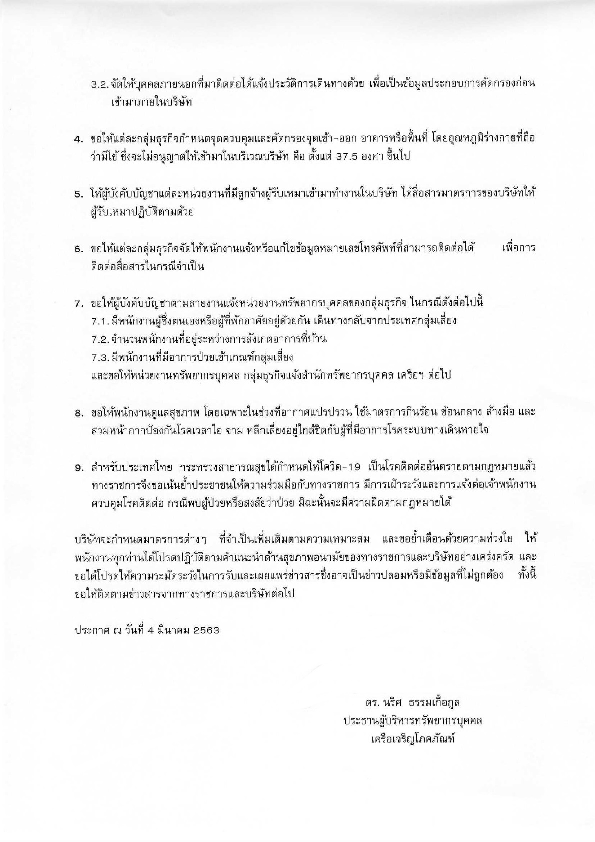 บริษัทจะกำหนดมาตรการต่างๆ ที่จำเป็นเพิ่มเติมตามความเหมาะสม และขอย้ำเตือนด้วยความห่วงใย ให้พนักงานทุกท่านได้โปรดปฏิบัติตามคำแนะนำด้านสุขภาพอนามัยของทางราชการและบริษัทอย่างเคร่งครัด และ ขอได้โปรดให้ความระมัดระวังในการรับและเผยแพร่ข่าวสารซึ่งอาจเป็นข่าวปลอมหรือมีข้อมูลที่ไม่ถูกต้อง ทั้งนี้ ขอให้ติดตามข่าวสารจากทางราชการและบริษัทต่อไป