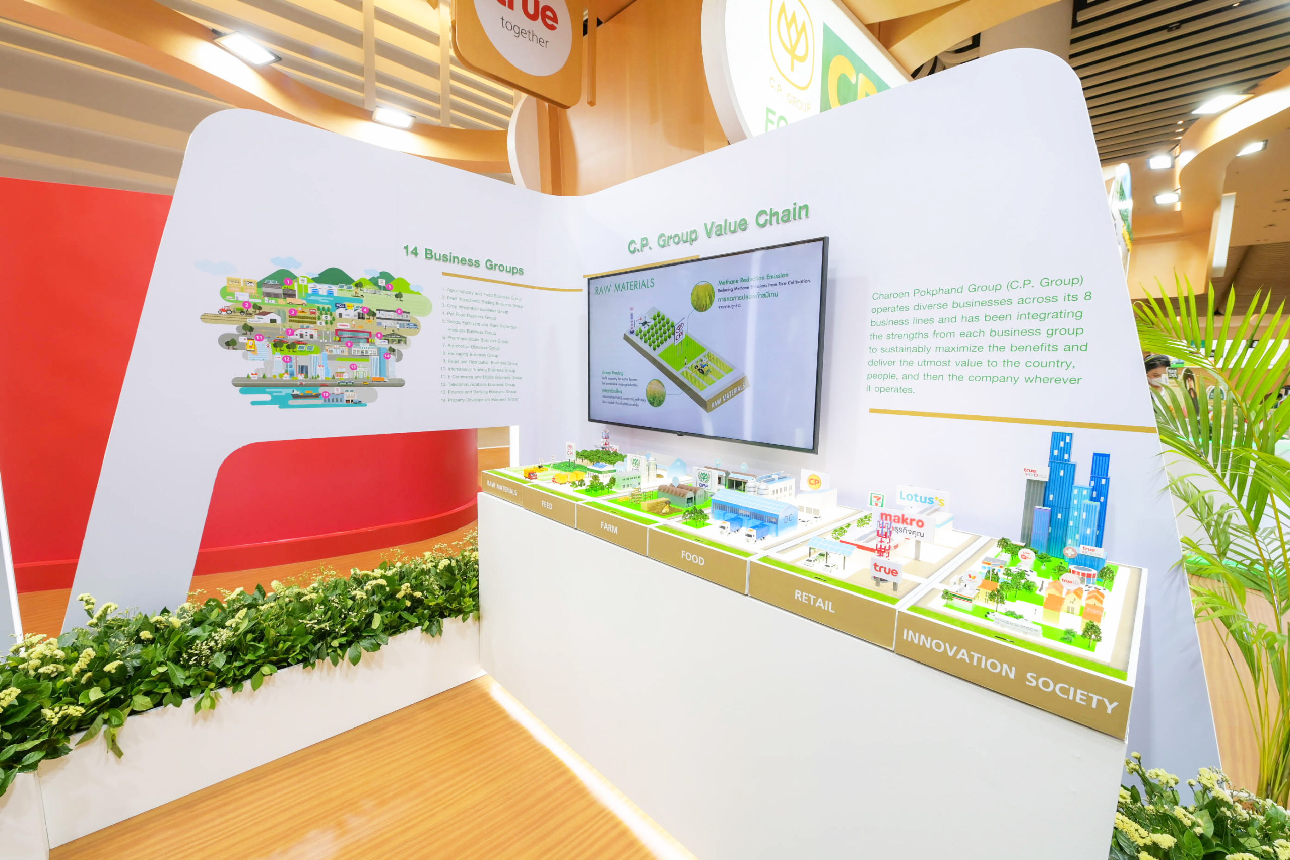 พร้อมกันนี้ ยังได้นำเสนอภาพของนโยบายการทำธุรกิจที่นำไปสู่การพัฒนาอย่างยั่งยืน ที่ครอบครอบคลุมการดำเนินงานตลอดห่วงโซ่คุณค่าทั้ง 14 กลุ่มธุรกิจใน 8 สายธุรกิจหลัก ผ่านโมเดลการทำธุรกิจที่ตั้งแสดงให้ผู้มาเยี่ยมชมได้เห็นภาพที่ชัดเจนยิ่งขึ้น