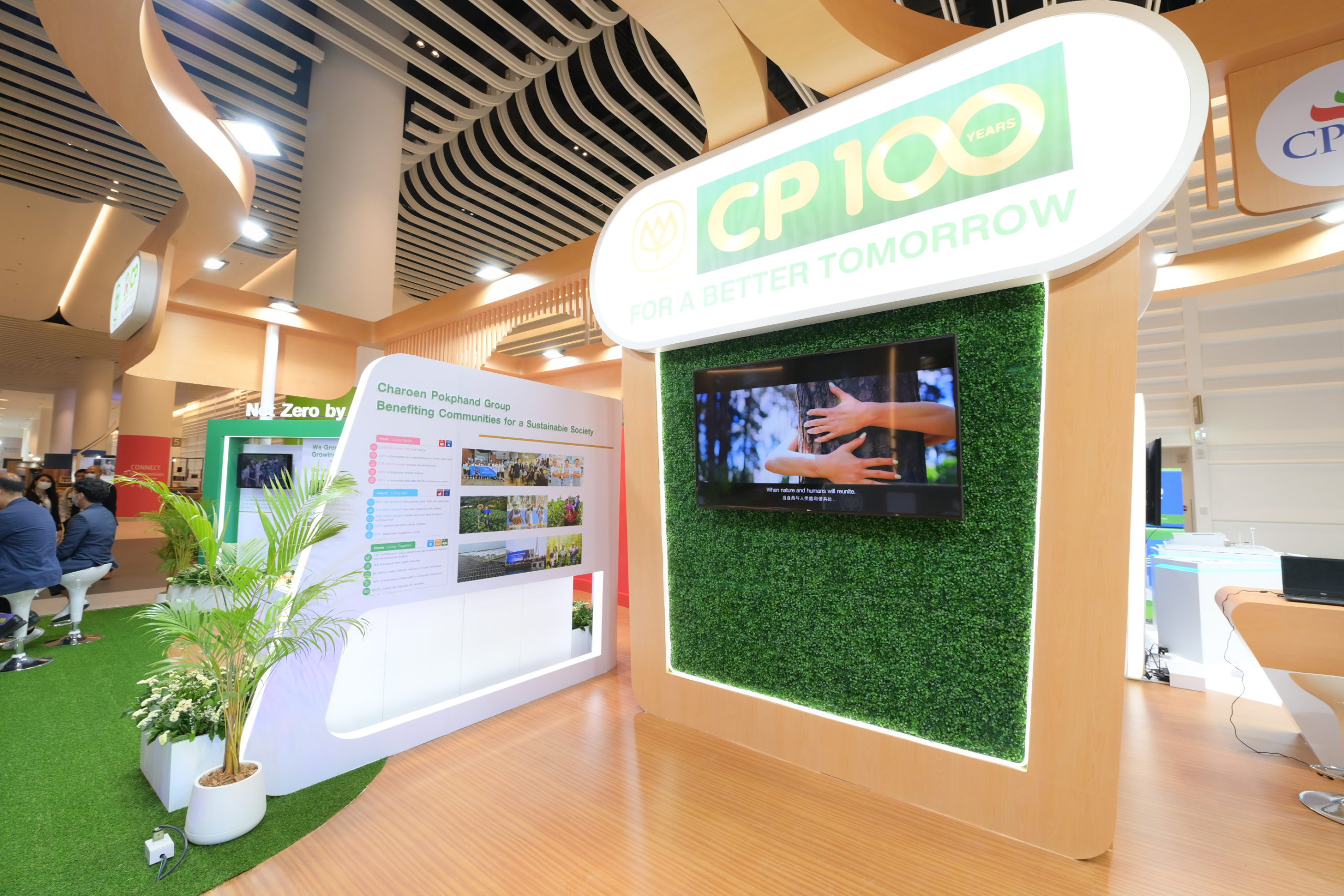 แวะเข้าไปในบูธของเครือฯ สิ่งที่แรกที่สะดุดสายตา คือ โลโก้ ซีพี100 พร้อมด้วยโลโก้ของ ซีพีเอฟ ซีพี ออลล์ และทรู ที่สื่อให้เห็นถึงความภาคภูมิใจในการทำธุรกิจ โดยได้นำเสนอนเทคโนโลยี นวัตกรรมและความสำเร็จที่นำไปสู่ความยั่งยืนของเครือฯ เพื่อแสดงให้ชาวโลกและนักลงทุนจากต่างประเทศได้เห็นความมุ่งมั่นของเครือฯ
