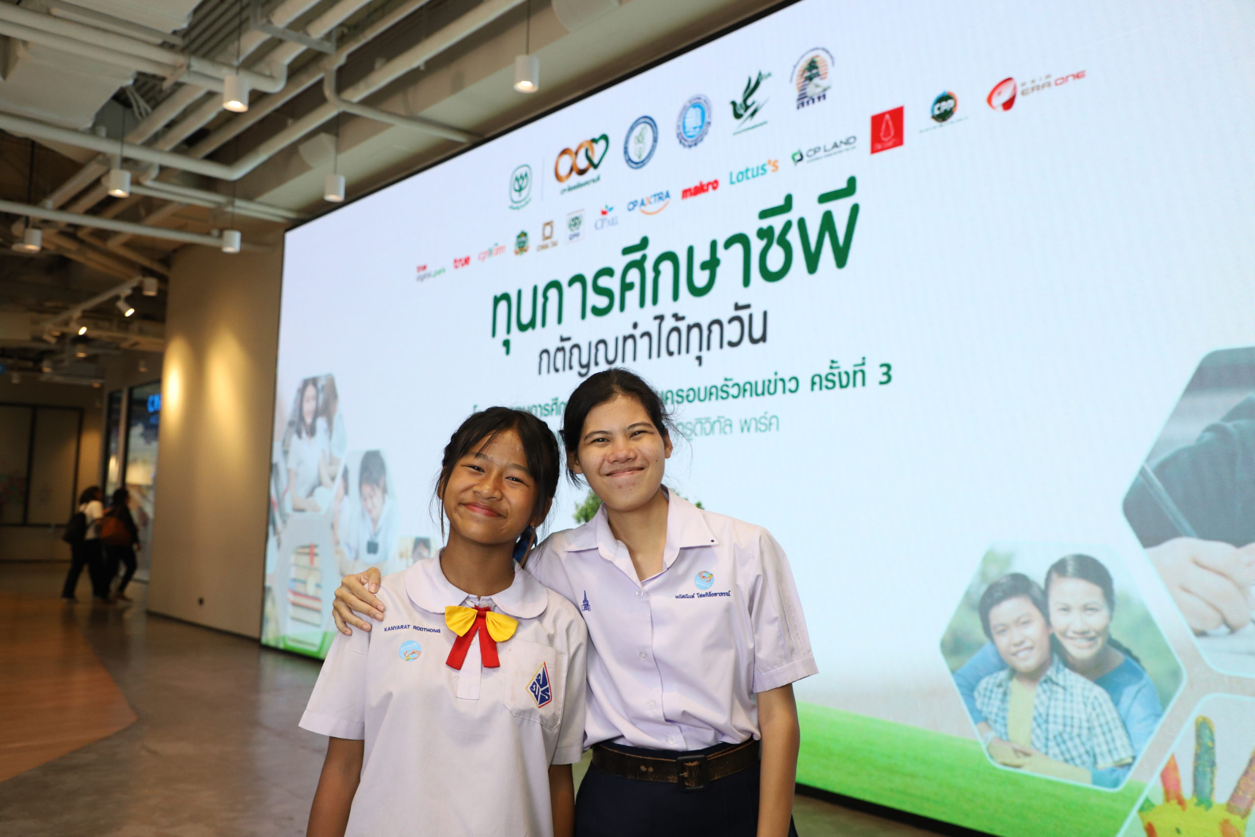 คุณเทียนชัย จูพัฒนกุล รองกรรมการผู้จัดการ ด้านสื่อสารองค์กรและกิจกรรมเพื่อสังคม ธุรกิจพืชครบวงจร ข้าว ขนส่งและบริการ และคุณกนกรัตน์ จุฑานนท์ ผู้จัดการอาวุโส ฝ่ายสื่อสารองค์กร บริษัท ซีพี แอ็กซ์ตร้า จำกัด (มหาชน) ให้เกียรติมอบทุนการศึกษาแก่น้อง ๆ ยุวชนจากกลุ่มสมาคมสื่อมวลชนเกษตรแห่งประเทศไทย