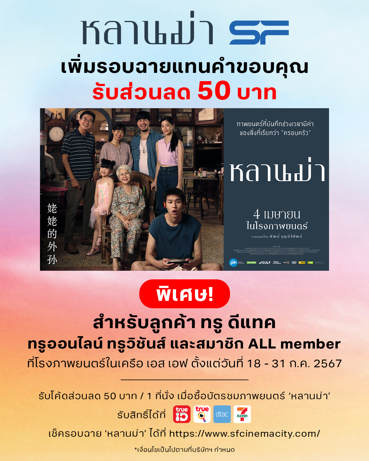 หลังจากที่ค่ายหนัง GDH สร้างปรากฏการณ์กวาดรายได้ทุบสถิติใหม่อีกครั้ง เมื่อภาพยนตร์เรื่อง “หลานม่า” ที่เข้าฉายในประเทศไทย, เอเชียตะวันออกเฉียงใต้, ฮ่องกง, ไต้หวัน และกำลังฉายที่ออสเตรเลียและนิวซีแลนด์ ทำรายได้บ็อกซ์ออฟฟิศทั่วโลกไปแล้วกว่า 1,200 ล้านบาท รวมถึงได้เข้าร่วมงานเทศกาลภาพยนตร์นานาชาติเมืองคานส์ ครั้งที่ 77 และเตรียมเข้าฉายในเทศกาลหนังที่นิวยอร์ค รวมถึงเดือนสิงหาคมที่จะเข้าฉายในตลาดใหญ่ เช่น จีน, ญี่ปุ่น, เกาหลีใต้ และในยุโรปที่เบลเยียม, เนเธอร์แลนด์, ลักเซมเบิร์ก จากนั้นจะเดินหน้าไปฉายทั่วโลก และหลังจากมีกระแสตอบรับดีจากต่างประเทศ วันนี้จึงมีการนำภาพยนตร์เรื่องหลานม่ากลับมาเพิ่มรอบฉายอีกครั้ง ที่โรงภาพยนตร์ SF ทั่วประเทศ นอกจากนี้ GDH ยังมีแคมเปญพิเศษร่วมกับเครือเจริญโภคภัณฑ์ หรือ ซีพี ส่งเสริมความกตัญญู มอบส่วนลดพิเศษ 50 บาท/ที่นั่งสำหรับลูกค้า TRUE, ดีแทค , สมาชิก ALL member, ทรู ออนไลน์, ทรู วิชั่นส์