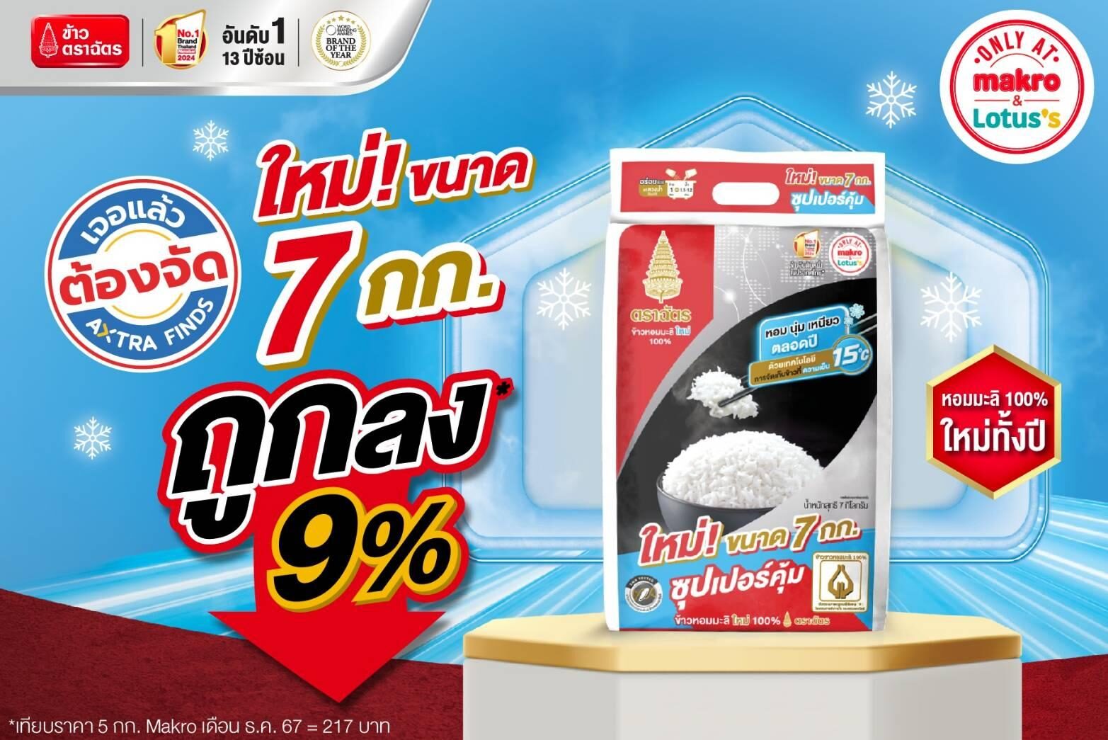 ข้าวตราฉัตรขนาดใหม่ ซุปเปอร์คุ้ม 7 กิโลกรัม เจอแล้วต้องจัด! เพราะการันตีด้วยคุณภาพข้าวหอมมะลิใหม่ตราฉัตร 100% ที่สุดของความหอม นุ่ม เหนียว พิเศษ ด้วยเทคโนโลยีการจัดเก็บข้าวด้วยความเย็นที่อุณหภูมิ 15 องศา ช่วยล็อกความสดใหม่ ได้ตลอดทั้งปี มาตรฐานแน่นอนทุกถุงเหมือนกันทั่วโลก ข้าวยอดนิยมอันดับ 1 ครองใจผู้บริโภค ต่อเนื่อง 13 ปีซ้อน จากรางวัล “Marketeer No.1 Brand Thailand 2024″ ที่ยังคงมุ่งมั่นพัฒนาและต่ออดผลิตภัณฑ์เพื่อตอบโจทย์ทุกความต้องการของผู้บริโภคให้ได้มากที่สุด พร้อมท้าพิสูจน์ความคุ้มมากกว่าแล้ววันนี้ เฉพาะที่แม็คโครและโลตัสทุกสาขาทั่วไทยเท่านั้น