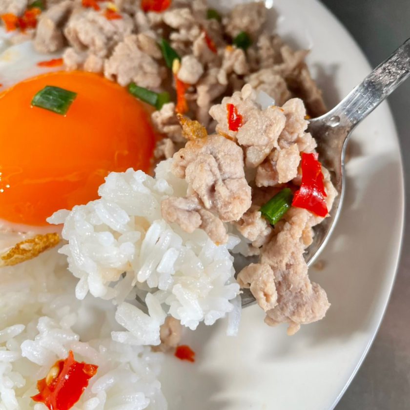 เลยลองตาม เอ้อ ดีจริง อร่อยจริง หุงใหม่ ๆ ตักใส่จาน แล้วทอดไข่เป็ดมาโปะ แล้วรวนหมูสับมาโรยหน้า ซอยพริกตามลงไป เหยาะน้ำปลาหน่อยนะ