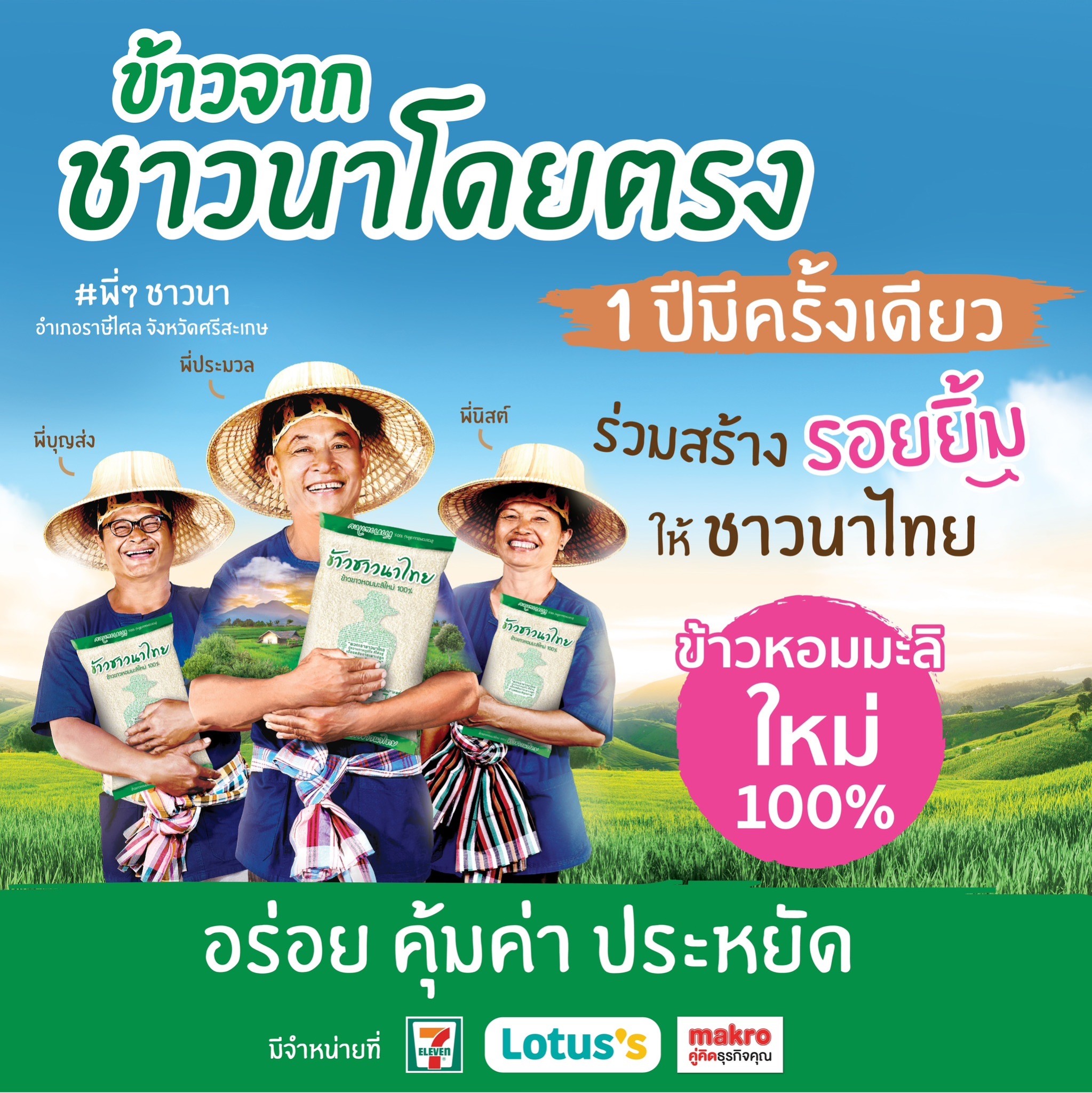 เครือเจริญโภคภัณฑ์ ผนึกกำลัง ร่วมกันระหว่าง ข้าวตราฉัตร เซเว่นอีเลฟเว่น โลตัส แม็คโคร นำศักยภาพของธุรกิจในเครือ ผลิตและจัดจำหน่าย ข้าวชาวนาไทย ขนาด 5 กิโลกรัม ราคาเพียง 189 บาท เท่านั้น ซึ่งจะเริ่มจำหน่ายตั้งแต่วันที่ 18 มกราคม นี้ เป็นต้นไป จึงอยากเชิญชวนผู้บริโภค มาทดลองชิมข้าวหอมมะลิใหม่ต้นฤดูที่มาจากชาวนาโดยตรง เก็บเกี่ยวทุกรอยยิ้ม ทุกคำมีความหมาย สร้างรอยยิ้ม ความสุข และความภูมิใจให้ชาวนาไทย