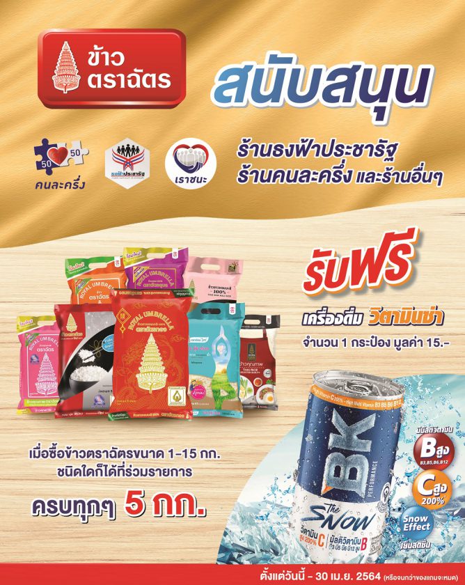 ข้าวตราฉัตร ร่วมสนับสนุน ร้านธงฟ้าประชารัฐ ร้านคนละครึ่ง และเราชนะ ตามมาตรการกระตุ้นเศรษฐกิจภายในประเทศของภาครัฐ โดยจัดโปรโมชั่นพิเศษ ซื้อข้าวตราฉัตรขนาด 1-15 กก. ชนิดใดก็ได้ที่ร่วมรายการ ครบทุกๆ 5 กก. รับฟรี! เครื่องดื่มวิตามินซ่า BK จำนวน 1 กระป๋อง มูลค่า 15 บาท ตั้งแต่วันนี้ – 30 เม.ย. 2564 หรือจนกว่าของแถมจะหมด เฉพาะร้านค้าที่ร่วมรายการเท่านั้น เพื่อกระตุ้นเศรษฐกิจรอบใหม่ ผ่านการใช้จ่ายของครัวเรือนรูปแบบต่างๆ และให้ประชาชนได้รับสิทธิประโยชน์อย่างเต็มที่