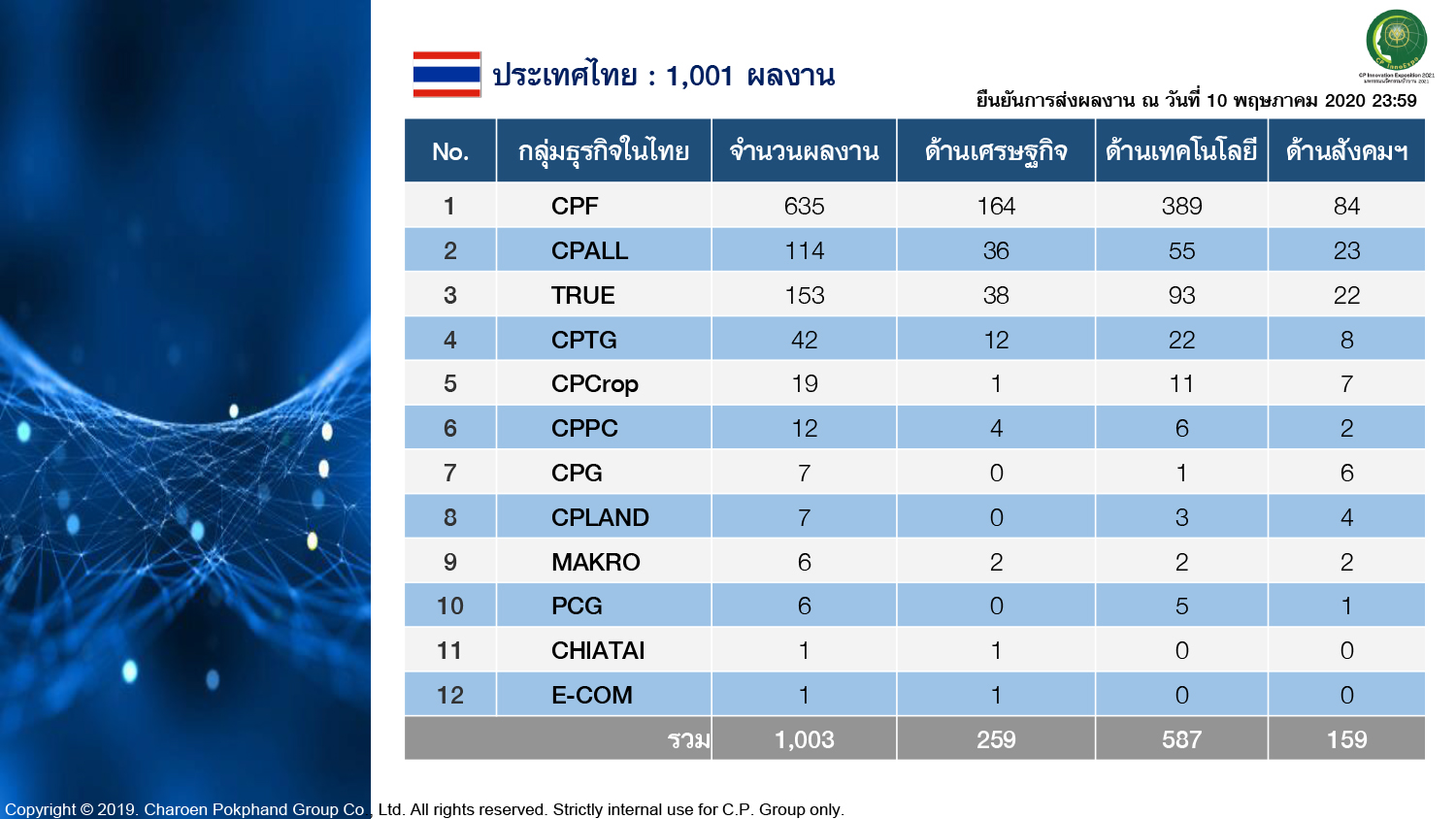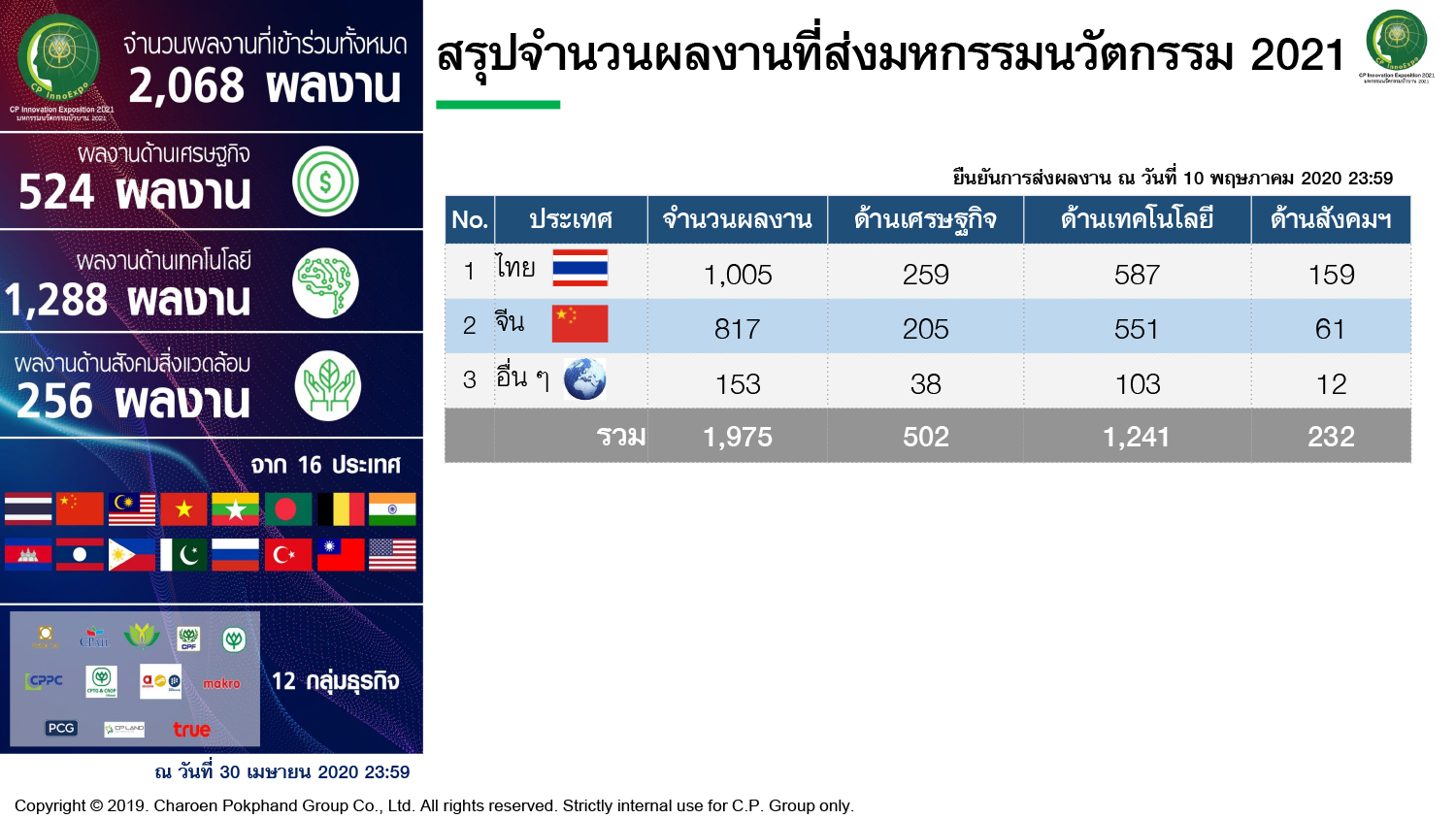 ทั้งนี้ คุณบงกชธร เพ็ชรนิจินดา เลขานุการคณะกรรมการประสานงานฯ เผยถึงภาพรวมการรับสมัครผลงานนวัตกรรม 2021 ได้มีการเปิดรับสมัครตั้งแต่ 1 ธันวาคม 62 – 30 เมษายน 63 มีจำนวนผลงานทั้งหมดที่ส่งมาในระบบจำนวน 2,068 ผลงาน ทั้งนี้กรรมการจะทำการตรวจ 1,975 ผลงาน จาก 2,068 ผลงานที่ส่งเข้ามา เนื่องจากมีการคัดออกจากระบบเพราะข้อมูลไม่ครบถ้วน โดย 1,975 ผลงานเป็นของประเทศไทย จำนวน 1,005 ผลงาน แบ่งเป็นด้านเศรษฐกิจ 259 ด้านเทคโนโลยี 587 ด้านสังคมและสิ่งแวดล้อม 159