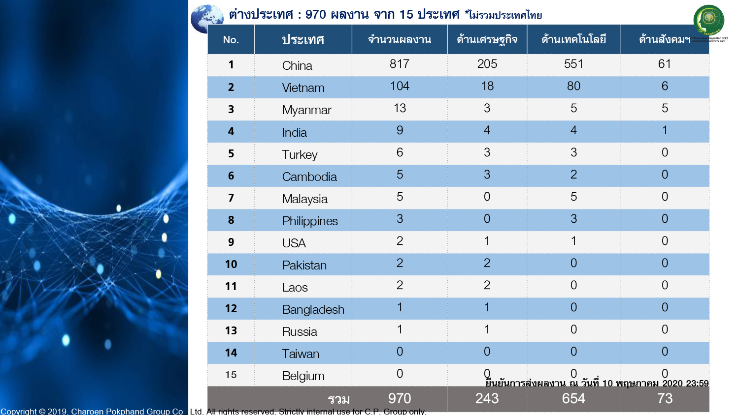 ส่วนประเทศอื่นๆ มีผลงานจำนวน 153 ผลงาน แบ่งเป็นด้านเศรษฐกิจ 38 ด้านเทคโนโลยี 103 ด้านสังคมและสิ่งแวดล้อม 12