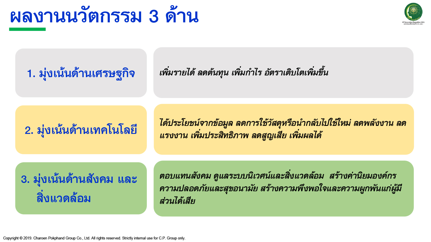 • ด้านเทคโนโลยี ได้ประโยชน์จากข้อมูล ลดการใช้วัสดุหรือนำกลับมาใช้ใหม่ ลดแรงงาน ลดการสูญเสีย