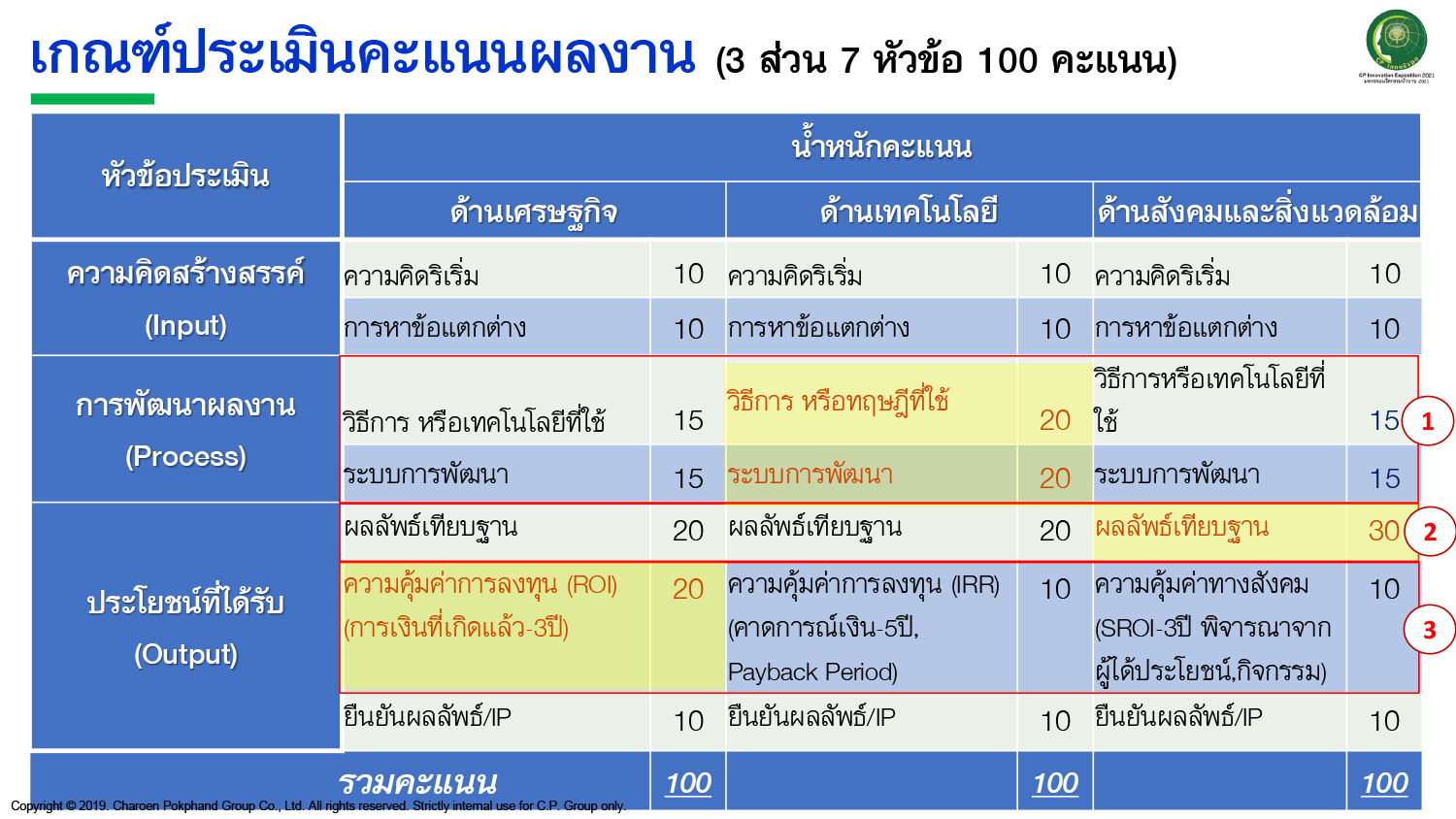 ทั้งนี้หัวข้อการประเมิน คณะกรรมการจะพิจารณาถึงความคิดริเริ่ม ,การหาข้อแตกต่าง,วิธีการ/ทฤษฎี/เทคโนโลยีที่ใช้ ,ระบบการพัฒนา ,ผลลัพธ์เทียบฐาน ,ความคุ้มค่าในการลงทุน ,การยืนยันผลลัพธ์/IP