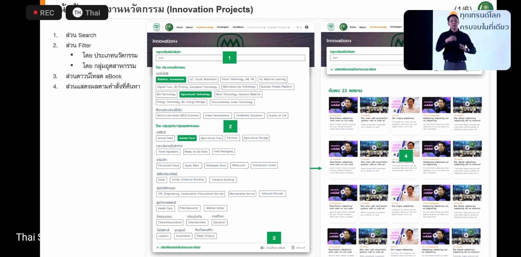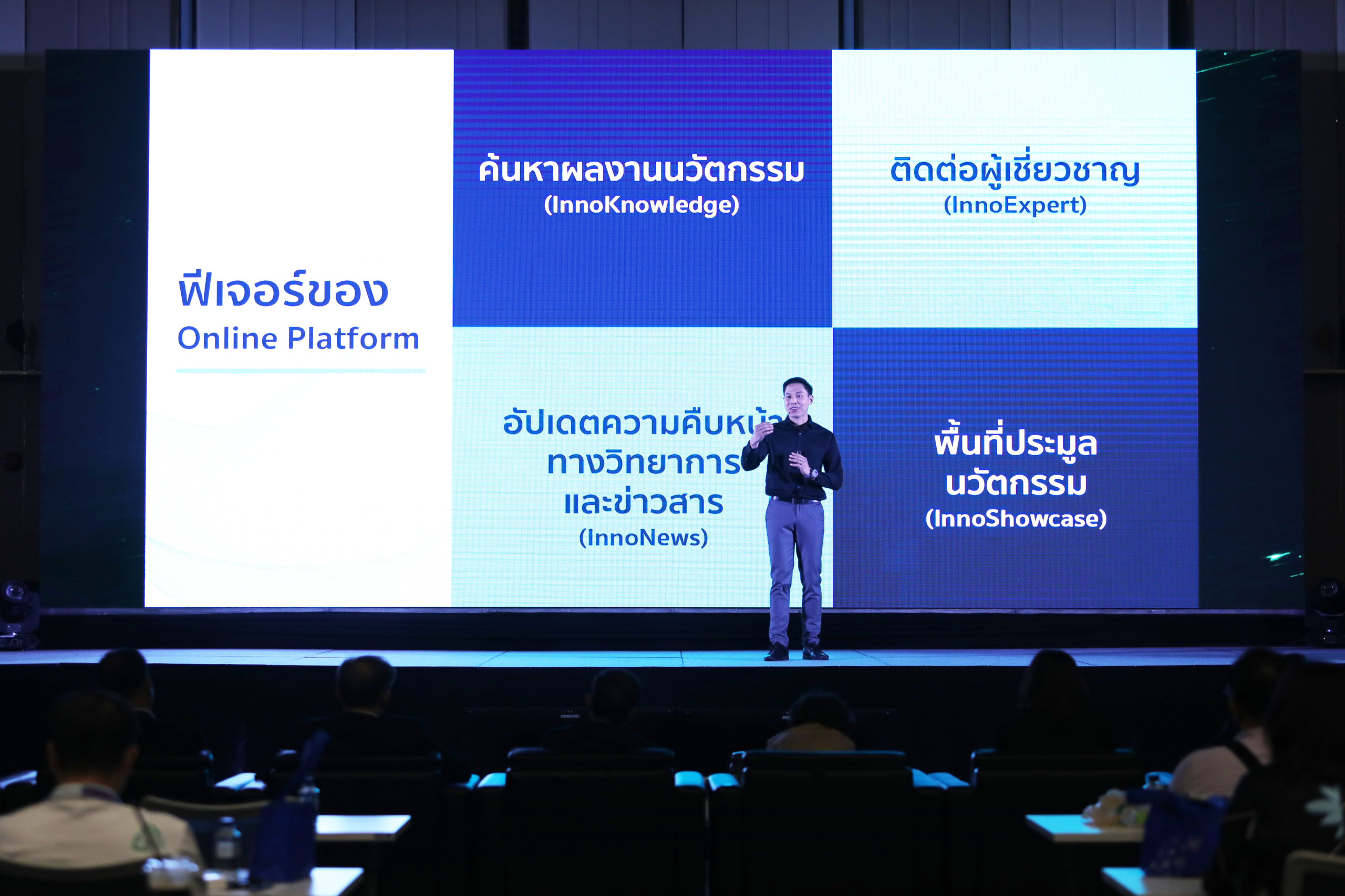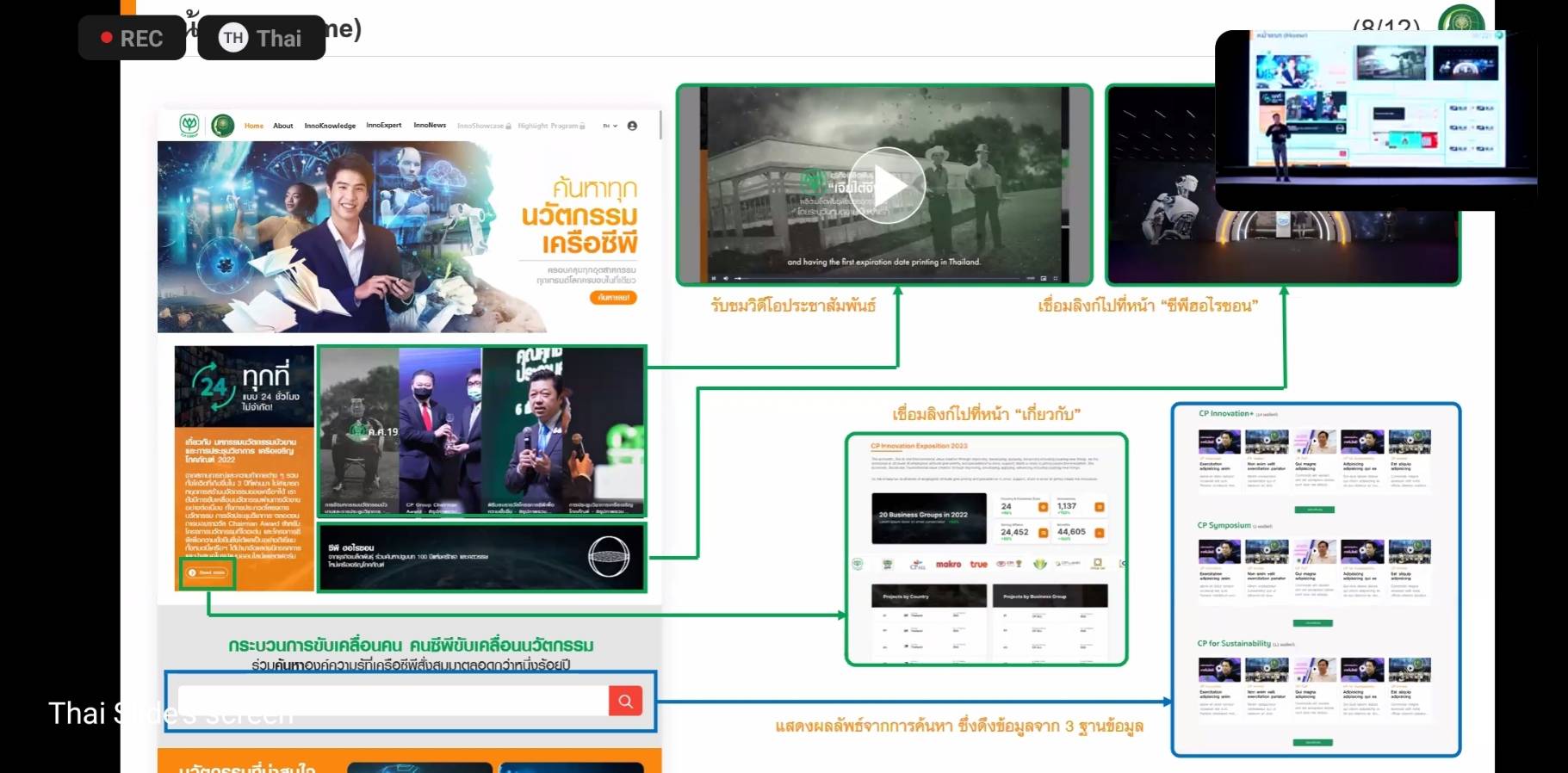 ภายในงานเริ่มต้นกิจกรรม ด้วยการแนะนำ แพลตฟอร์มแห่งนวัตกรรม ‘CP Innovation Online Platform’ ชุมชนนวัตกรรมแบบไร้พรมแดน 24 ชั่วโมง ของคนซีพี ที่เป็นศูนย์รวมความรู้และการแลกเปลี่ยนข้อมูล เพื่อมุ่งเสริมการสร้างนวัตกรรมที่นำไปสู่การเอาชนะความเปลี่ยนแปลง โดยคุณศักดา ศิริรัตน์ จาก บจ.ออลล์ เทรนนิ่ง ให้เกียรติมาแนะนำฟีเจอร์ของแพลตฟอร์ม ที่จะช่วยในการค้นหาผลงานนวัตกรรม (InnoKnowledge) ของคนซีพี พร้อมอัพเดทความคืบหน้าทางวิทยาการและข่าวสาร (InnoNews) รวมทั้งยังเป็นพื้นที่สำหรับการประมูลนวัตกรรม (InnoShowcase) เปิดโอกาสให้สามารร่วมลงทุนและซื้อนวัตกรรม รวมถึงติดต่อขอคำแนะนำจากผู้เชี่ยวชาญ (InnoExpert) ได้อีกด้วย