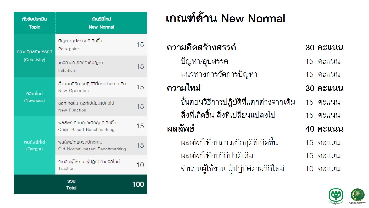 เกณฑ์การประเมินผลงานด้านนวัตกรรมวิถีใหม่ (New Normal) มุ่งเน้นเรื่องความคิดริเริ่มสร้างสรรค์ ความใหม่ และผลลัพธ์