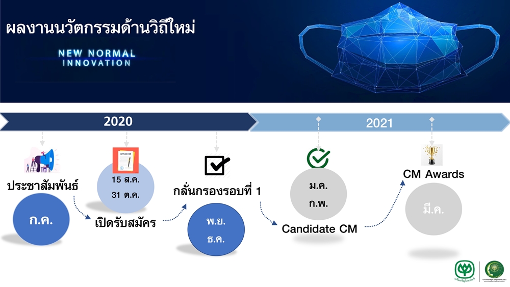 ทั้งนี้จะมีการเปิดรับผลงาน “นวัตกรรมวิถีใหม่ New Normal” ตั้งแต่วันที่ 15 สิงหาคม -31 ตุลาคม 2563 จากนั้นจะมีการกลั่นกรองผลงานในรอบที่ 1 ราวเดือนพศจิกายน – ธันวาคม 2563 และพิจารณาคัดเลือกผลงานเพื่อรับรางวัล Chairman Awards เดือน มกราคม – กุมภาพันธ์ 2564