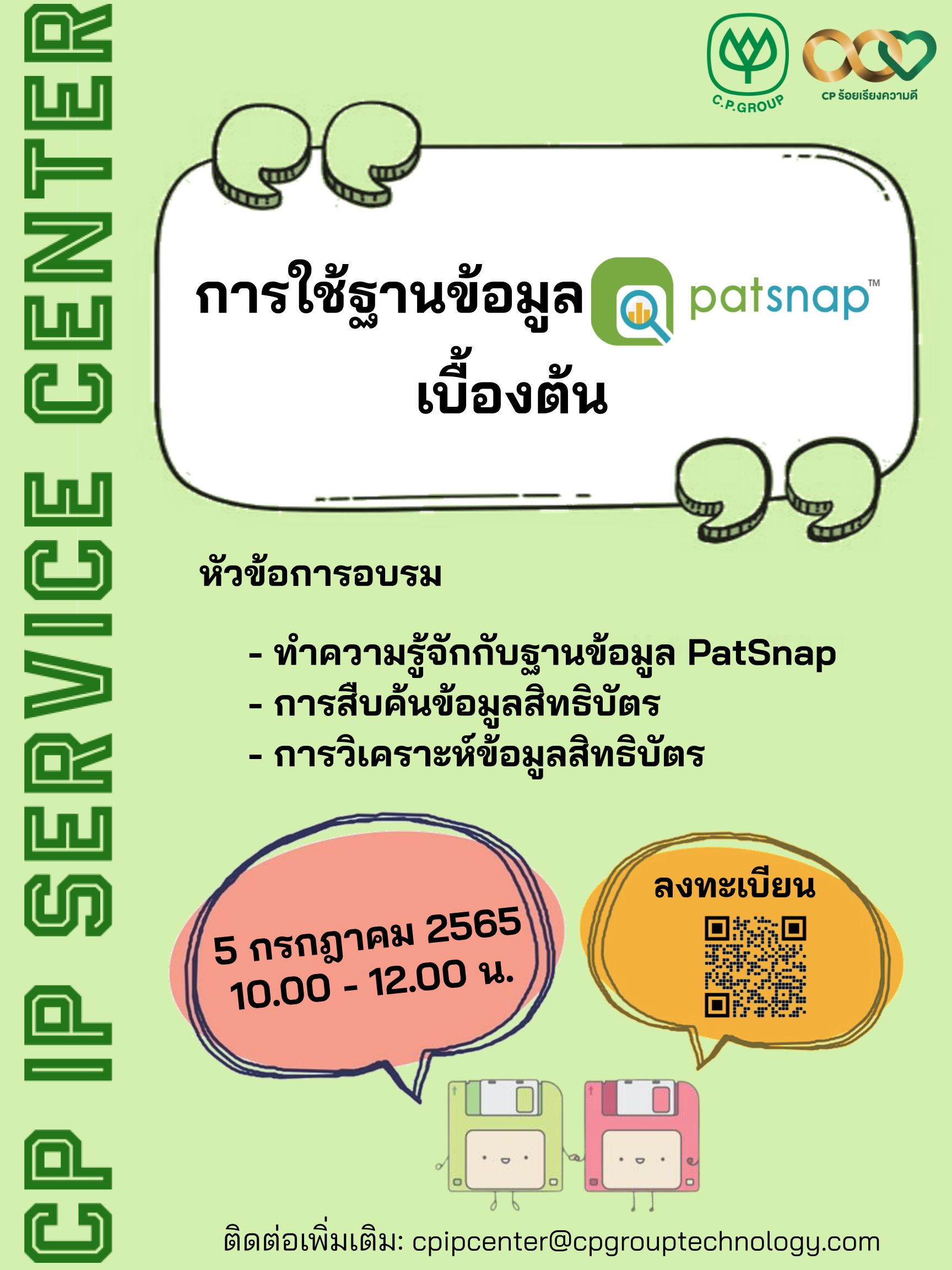 กลับมาอีกครั้งกับคอร์สอบรมฟรี จาก CP IP Service Center ซึ่งครั้งนี้เปิดจัดอบรมในหัวข้อ “การใช้ฐานข้อมูล PatSnap เบื้องต้น” ในรูปแบบออนไลน์ให้แก่บุคลากรเครือเจริญโภคภัณฑ์ฟรี ไม่เสียค่าใช้จ่าย ในวันอังคารที่ 5 กรกฎาคม 2565 เวลา 10.00 – 12.00 น. ผ่านทาง True Vroom