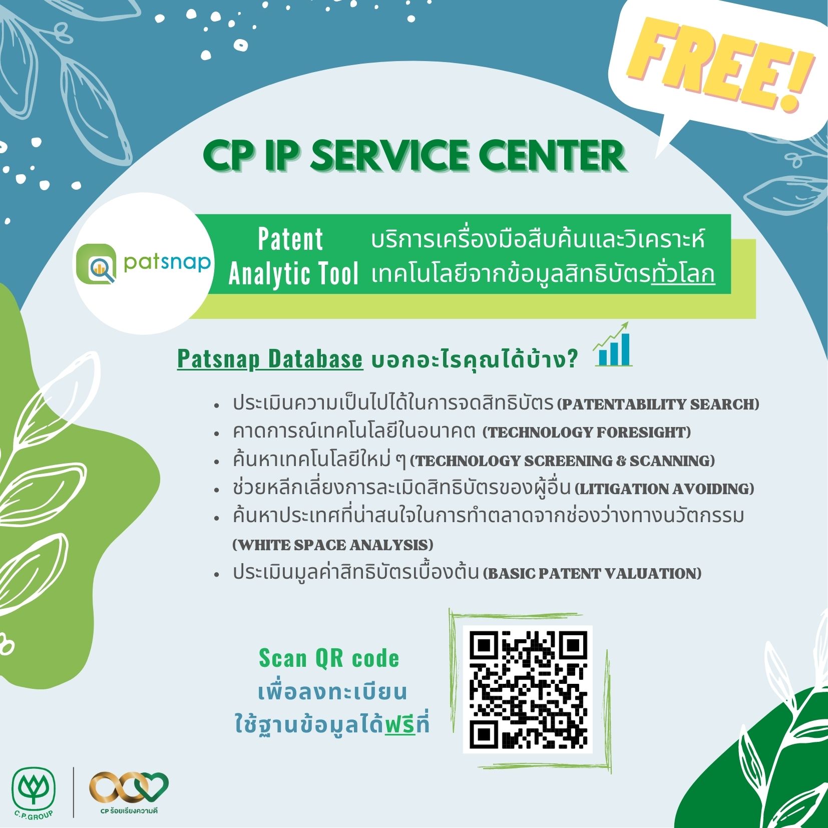 CP IP Service Center ขอเรียนเชิญทุกท่านลงทะเบียนเข้าใช้งานฐานข้อมูลสิทธิบัตร PatSnap สำหรับใช้ในการสืบค้นและวิเคราะห์เทคโนโลยีจากข้อมูลสิทธิบัตรทั่วโลก ซึ่งท่านสามารถนำข้อมูลที่ได้จากฐานข้อมูลดังกล่าวไปใช้ในการศึกษาแนวโน้มเทคโนโลยี ต่อยอดงานวิจัยและนวัตกรรม รวมถึงการวิเคราะห์วางแผนการตลาดให้กับธุรกิจได้ โดยพนักงานในเครือเจริญโภคภัณฑ์สามารถลงทะเบียนเข้าใช้งานได้ฟรี ไม่มีค่าใช้จ่าย!