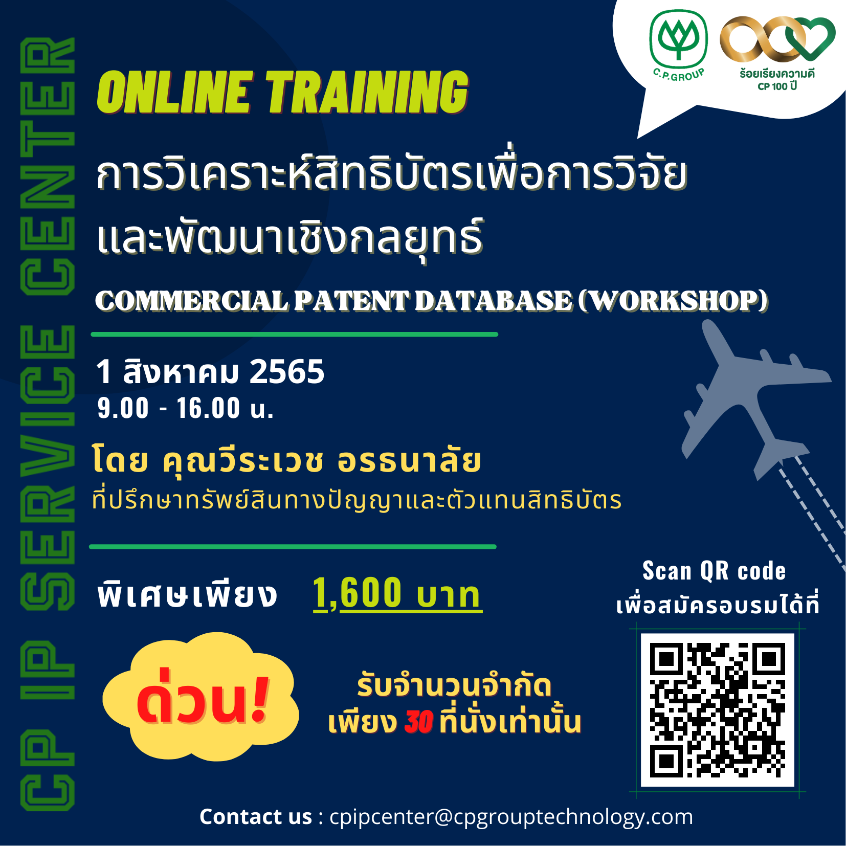 CP IP Service Center เครือเจริญโภคภัณฑ์ เปิดตัวหลักสูตรอบรมทรัพย์สินทางปัญญาใหม่ล่าสุด เอาใจทีม R&D ในหัวข้อ “การวิเคราะห์สิทธิบัตรเพื่อการวิจัยและพัฒนาเชิงกลยุทธ์ Commercial Patent Database (Workshop)” รูปแบบออนไลน์ ผ่านทาง True Vroom ในวันจันทร์ที่ 1 สิงหาคม 2565 เวลา 9.00 – 16.00 น. โดย คุณวีระเวช อรธนาลัย วิทยากรผู้เชี่ยวชาญในวงการนวัตกรรรมและทรัพย์สินทางปัญญาระดับต้น ๆ ของประเทศ ค่าลงทะเบียนเพียง 1,600 บาท เท่านั้น