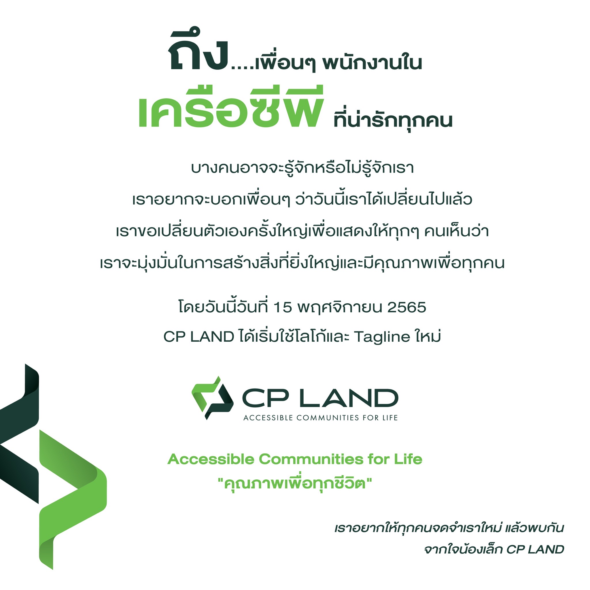 โดยวันนี้วันที่ 15 พฤศจิกายน 2565 CP LAND ได้เริ่มใช้โลโก้และ Tagline ใหม่