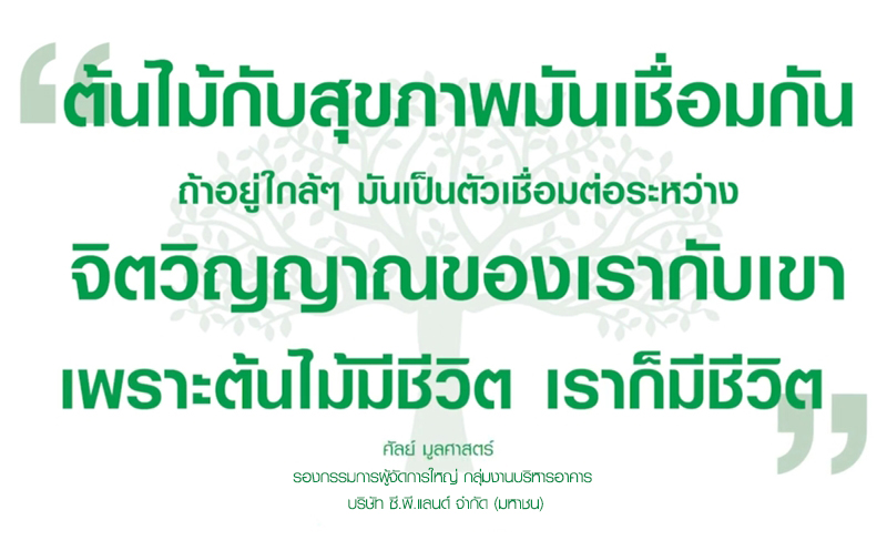 “เครือฯ มีนโยบาย Zero Carbon และ Global Neutral สอดคล้องกับความยั่งยืนทางธรรมชาติ เป็นสิ่งที่ซีพีแลนด์พึงกระทำโดยหน้าที่ และในฐานะที่เราเป็นคนที่อยู่อาศัยพื้นที่โลกอยู่ อาคารของเราเป็นการใช้ทรัพยากรทางธรรมชาติ คือแปรรูปจากภูเขา หินดีต่างๆ มาก่อสร้างเป็นรูปอาคาร เอาทรัพยากรมาใช้ตั้งเยอะ และเราควรทำอะไรแทนกลับไปยังธรรมชาติได้ อันนี้เป็นเรื่องที่เรามองว่าเป็นหน้าที่ของทุกคน เราอยากจะส่งไปใน DNA ของพนักงานทุกคน” คุณศัลย์ กล่าว