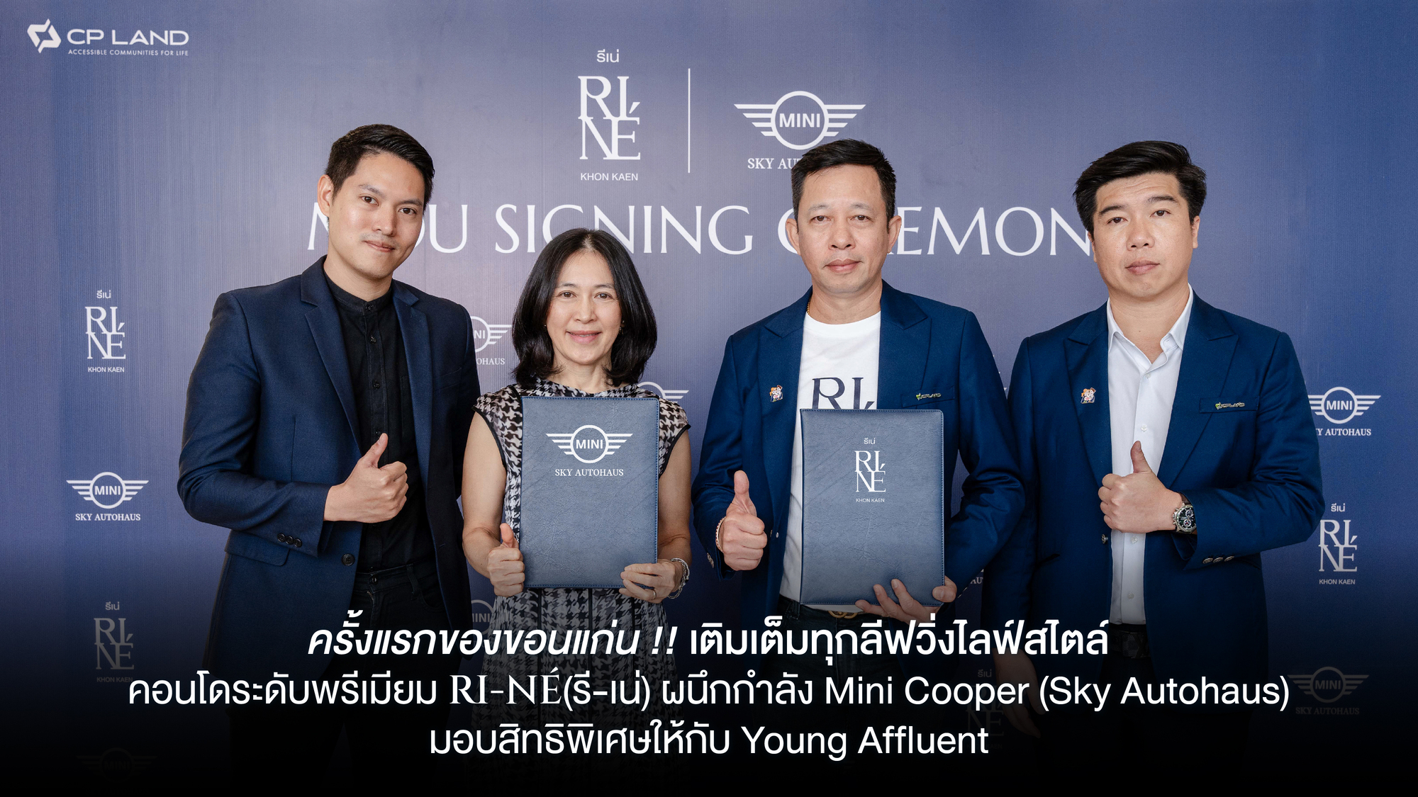 นายดำรงศักดิ์ ถุงเงิน ผู้อำนวยการอาวุโส ฝ่ายขายและการตลาดโครงการ บริการหลังการขายและลูกค้าสัมพันธ์ CP LAND เปิดเผยว่า โครงการ RI–NÉ (รี–เน่) จาก CP LAND เป็นโครงการคอนโดมิเนียมระดับพรีเมียม แบรนด์ใหม่ที่ทาง CP LAND ตั้งใจเปิดตลาด ขยายฐานลูกค้าไปยังกลุ่ม “Young Affluent” หรือ “ผู้มีกำลังซื้อยุคใหม่อายุน้อย” ที่มีอายุตั้งแต่ 25-40 ปี ประสบความสำเร็จอย่างรวดเร็ว มีกำลังซื้อสูง ในโซนหัวเมืองนำร่องที่จังหวัดขอนแก่นเป็นโครงการแรก ในอนาคตมีแนวโน้มจะพัฒนาและต่อยอดไปยังพื้นที่ภาคอื่นๆ และกรุงเทพมหานคร ตามแผนธุรกิจของบริษัท การลงนามในสัญญาความร่วมมือ (MOU) ในครั้งนี้จะเป็นก้าวสำคัญในการเสริมสร้างความแข็งแกร่งของธุรกิจ ซึ่งจะเป็นประโยชน์ทั้งต่อองค์กรและลูกค้า ความร่วมมือครั้งนี้สะท้อนให้เห็นถึง ความมุ่งมั่นในด้านสร้างเครือข่ายใหม่ต่อกันที่จะร่วมกันส่งต่อสิทธิประโยชน์ให้กับกลุ่มลูกค้า “Young Affluent” ของทั้งสองแบรนด์ วัตถุประสงค์สำคัญของ MOU ครั้งนี้ คือ การทำกิจกรรมทางการตลาดร่วมกัน (Co – Campaign) เพื่อตอบโจทย์ไลฟ์สไตล์ของ “Young Affluent” โดย Sky Autohaus ผู้จำหน่ายรถยนต์แบรนด์ Mini Cooper ได้มอบสิทธิพิเศษ อาทิ ส่วนลดในการซื้อรถยนต์ ส่วนลดค่าอะไหล่ และอื่นๆ ให้แก่ลูกบ้านโครงการ RI–NÉ (รี–เน่) ขอนแก่น นอกจากนี้โครงการ RI–NÉ (รี–เน่) ขอนแก่น จาก CP LAND ได้มอบสิทธิพิเศษ อาทิ ส่วนลดในการซื้อคอนโด และของแถมพิเศษให้กับลูกค้าเจ้าของรถยนต์ Mini Cooper ที่ออกรถกับทาง Sky Autohaus อีกด้วย