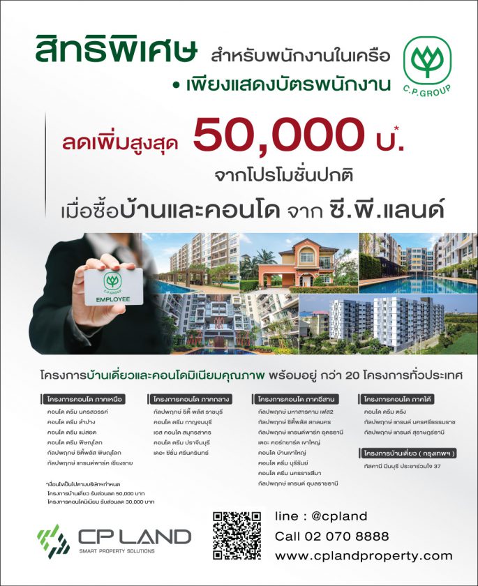 สิทธิพิเศษ สำหรับพนักงานในเครือ ซี.พี. เพียงแสดงบัตรพนักงาน #รับส่วนลดเพิ่มสูงสุด 50,000.- จากโปรโมชั่นปกติ เมื้อซื้อโครงการบ้าน และคอนโด จาก ซี.พี.แลนด์