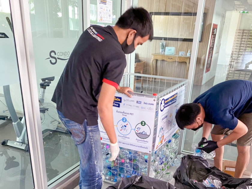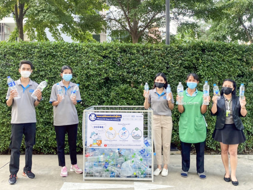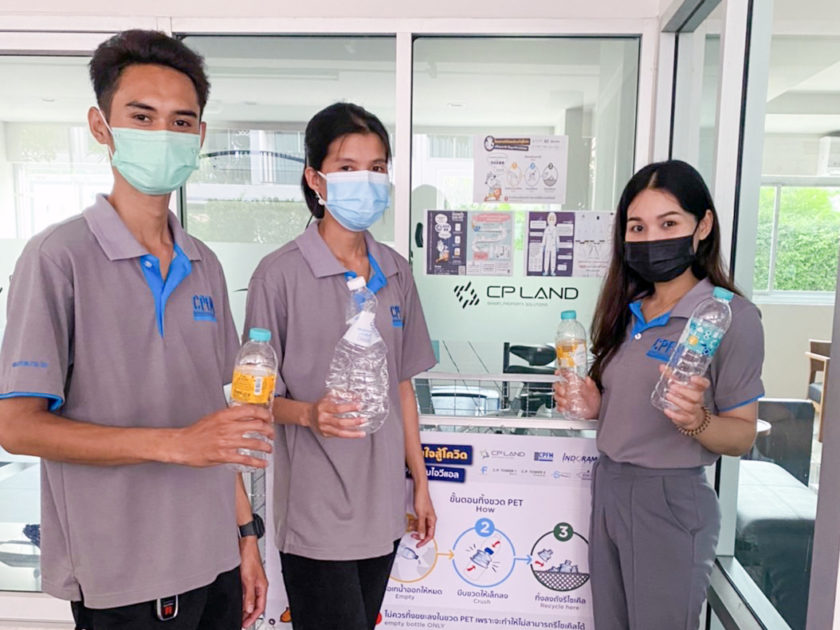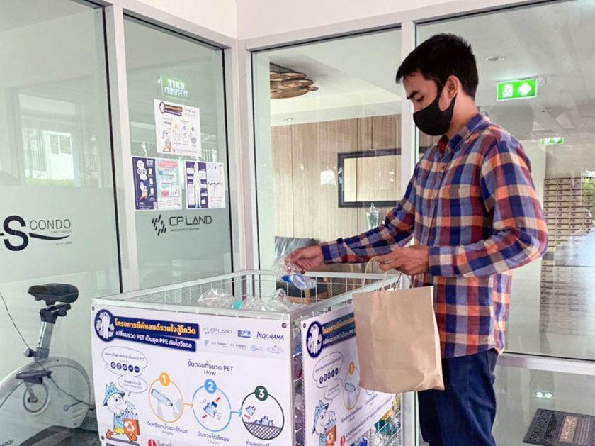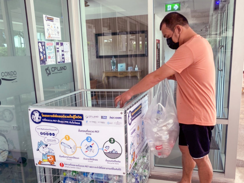 ซึ่งขวด PET ขนาด 600 มิลลิลิตรจำนวน 18 ขวด จะรีไซเคิลเป็นเส้นใยในการผลิตชุด PPE ได้ 1 ชุด” สามารถนำไปซักทำความสะอาดและนำกลับมาใช้ซ้ำได้ใหม่มากถึง 20 ครั้ง สนับสนุนให้ลูกบ้านและพนักงาน