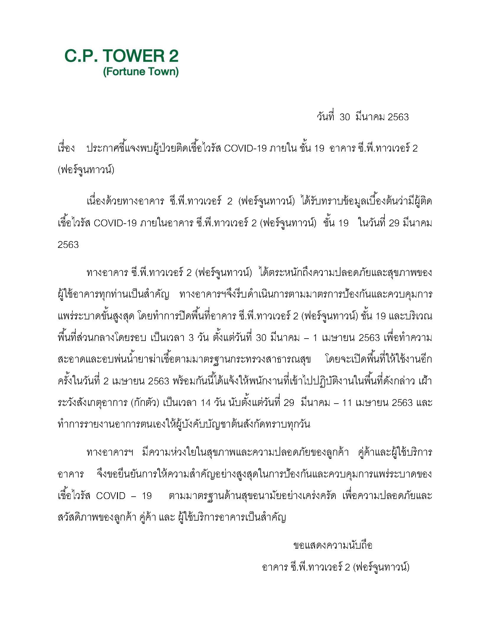 ซีพีแลนด์ชี้แจงพบผู้ติดเชื้อโควิด-19 ชั้น19 อาคารซี.พี.ทาวเวอร์2 ดำเนินการควบคุมป้องกันการระบาดตามมาตรฐานสาธารณาสุขแล้ว 30 มีนาคม 256331 มีนาคม 2020SystemNews, ข่าวธุรกิจ, ข่าวล่าสุด Post Views: 2,169