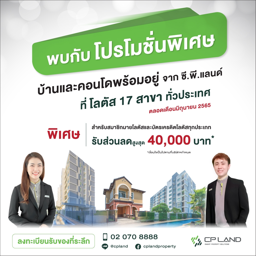 พิเศษ! สำหรับสมาชิกมายโลตัสและบัตรเครดิตโลตัสทุกประเภท รับส่วนลดสูงสุด 40,000 บาท เพียงแค่ซื้อบ้านหรือคอนโดพร้อมอยู่ จาก ซี.พี.แลนด์