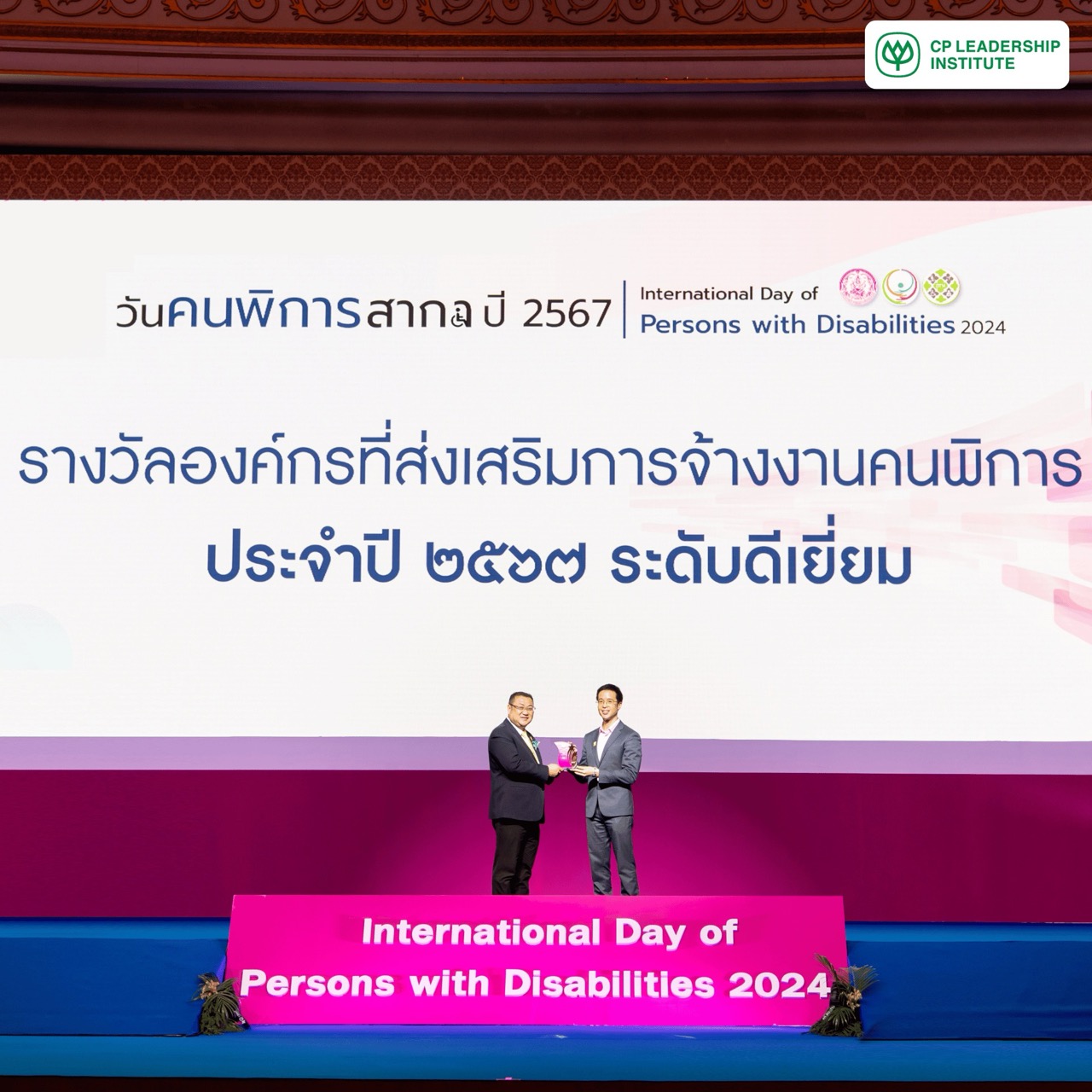 บริษัท พัฒนาผู้นำเครือเจริญโภคภัณฑ์ จำกัด (CPLI) ได้รับโล่ประกาศเกียรติคุณ รางวัลองค์กรที่ส่งเสริมการจ้างงานคนพิการ ประจำปี 2567 ระดับดีเยี่ยม ในงานวันคนพิการสากล ประจำปี 2567 จาก นายอนุกูล ปีดแก้ว ปลัดกระทรวงการพัฒนาสังคมและความมั่นคงของมนุษย์ (พม.) เพื่อเชิดชูองค์กรที่ให้การสนับสนุนการจ้างงานคนพิการ โดยมี คุณภูริปรัชญ์ บุนนาค รองกรรมการผู้จัดการด้านงานทรัพยากรบุคคล เป็นผู้แทนรับมอบรางวัล