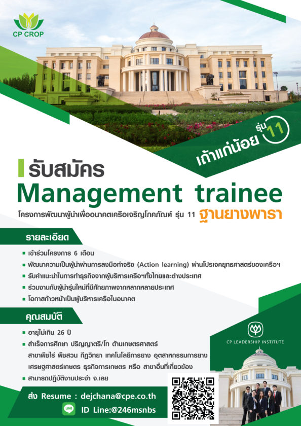 กลุ่มธุรกิจพืชครบวงจร เครือเจริญโภคภัณฑ์ รับสมัคร Management Trainee โครงการพัฒนาผู้นำเพื่ออนาคต เครือเจริญโภคภัณฑ์ รุ่นที่ 11 ฐานยางพารา หลักสูตรพัฒนาผู้นำรุ่นใหม่ ผ่านการลงมือทำธุรกิจจริง มุ่งเน้นการสร้างผู้นำที่ครบเครื่อง เป็น “คนดี คนเก่ง” มีวินัยในการบริหารจัดการตนเอง