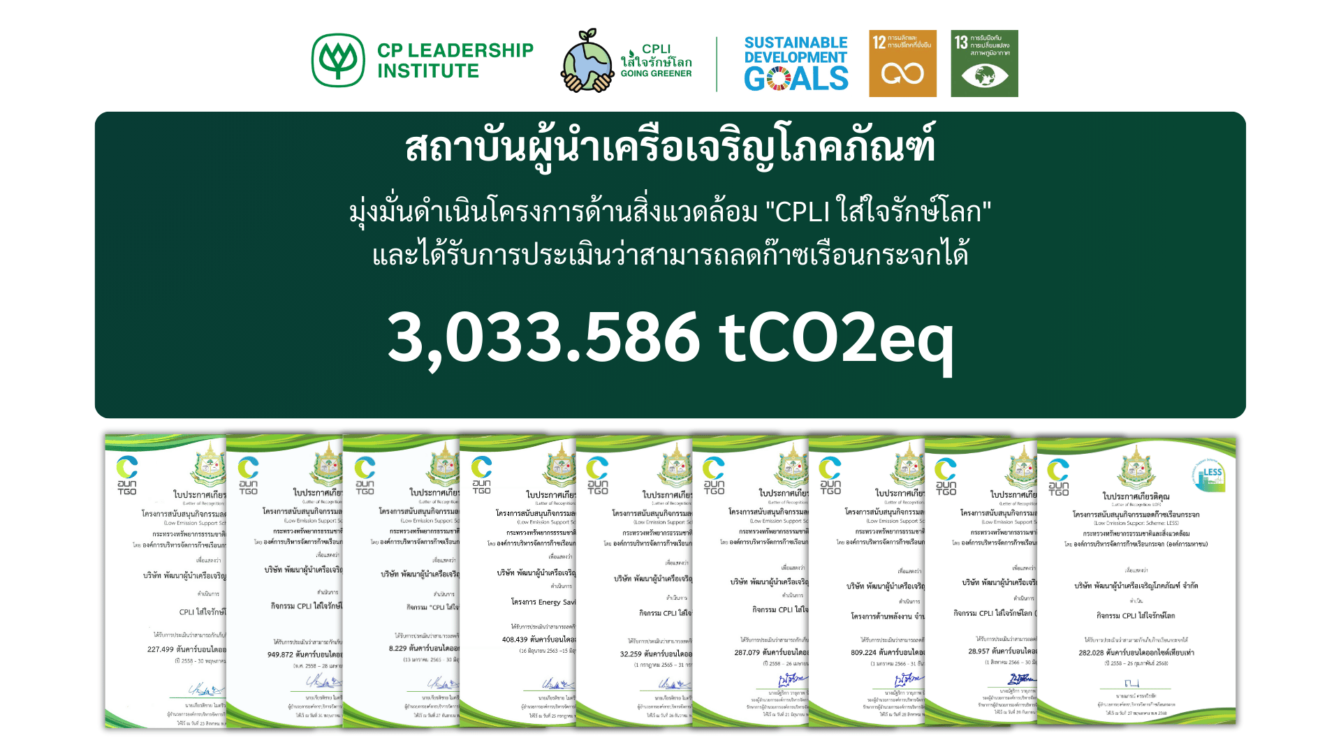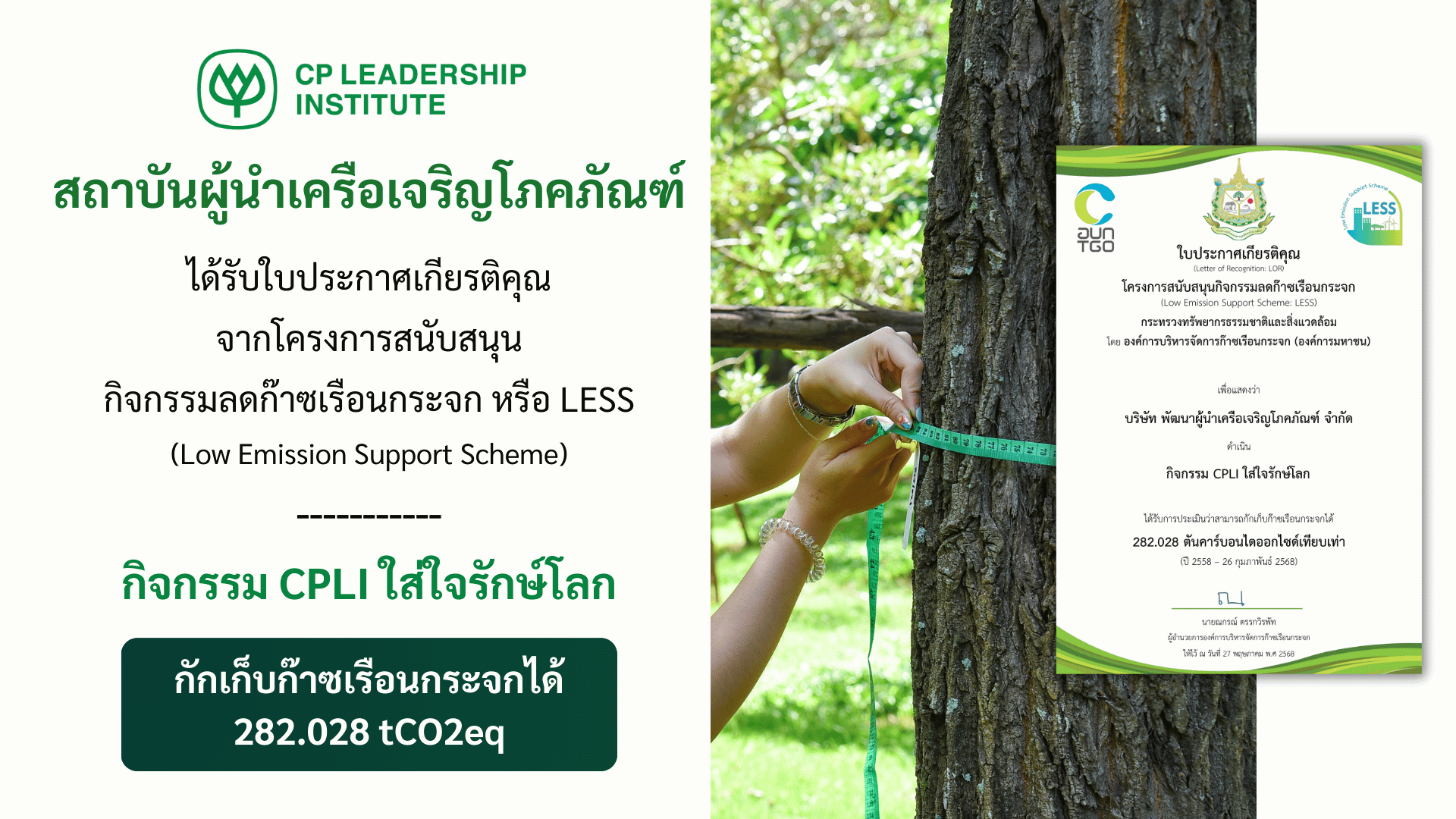 สถาบันผู้นำเครือเจริญโภคภัณฑ์ (CPLI) ได้รับมอบใบประกาศเกียรติคุณโครงการสนับสนุนกิจกรรมลดก๊าซเรือนกระจก (LESS) ฉบับที่ 9 จากองค์การบริหารจัดการก๊าซเรือนกระจก (อบก.) จากกิจกรรมที่เปิดโอกาสให้ผู้เข้าร่วมหลักสูตร FLP หรือ “เถ้าแก่น้อย” รุ่นที่ 16 ได้เรียนรู้แนวคิด ESG และลงมือปฏิบัติจริงผ่านการวัดต้นไม้กว่า 800 ต้นในพื้นที่ของ CPLI ซึ่งสะท้อนเป็นปริมาณการดูดซับก๊าซเรือนกระจกได้ถึง 282.028 ตันคาร์บอนไดออกไซด์เทียบเท่า