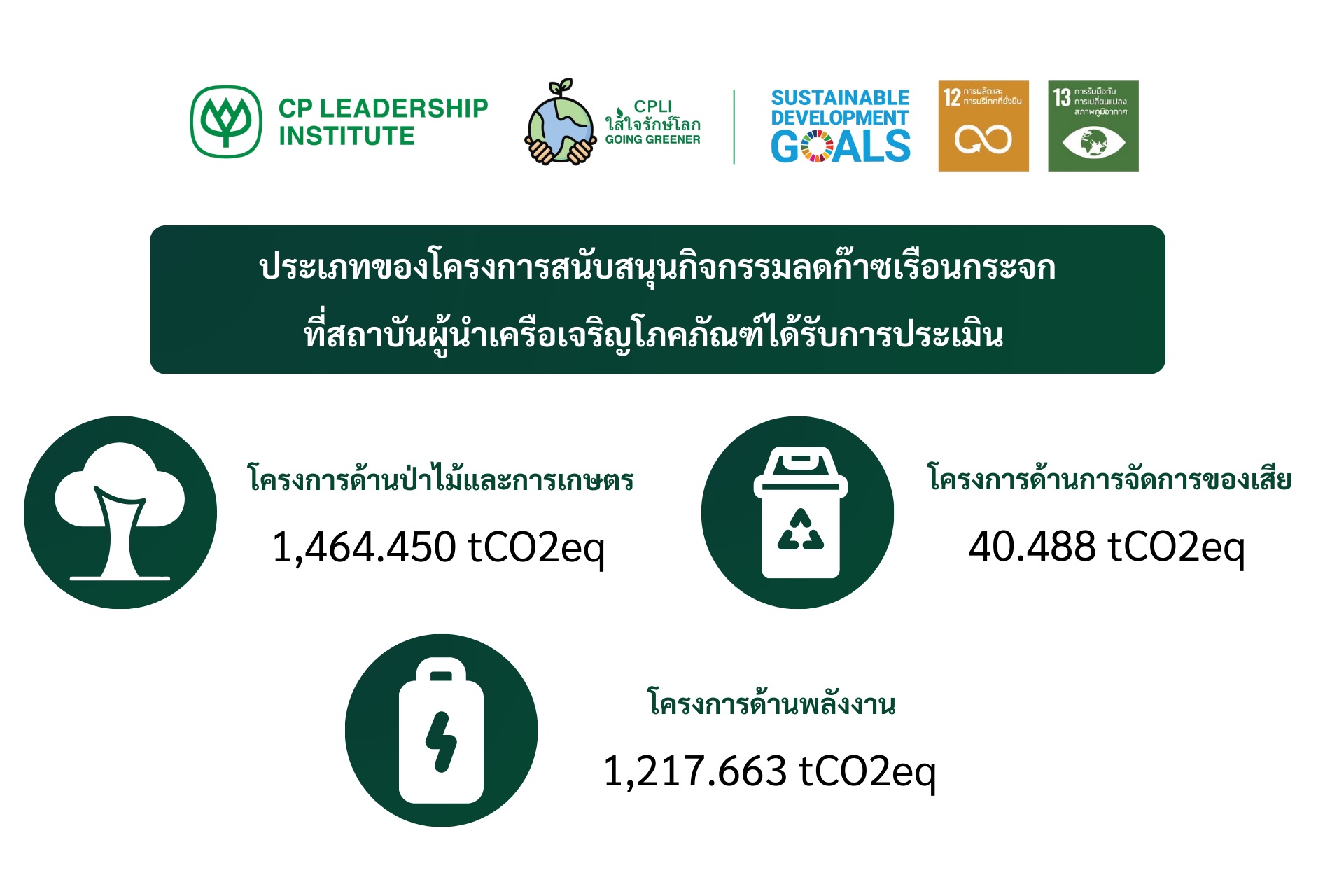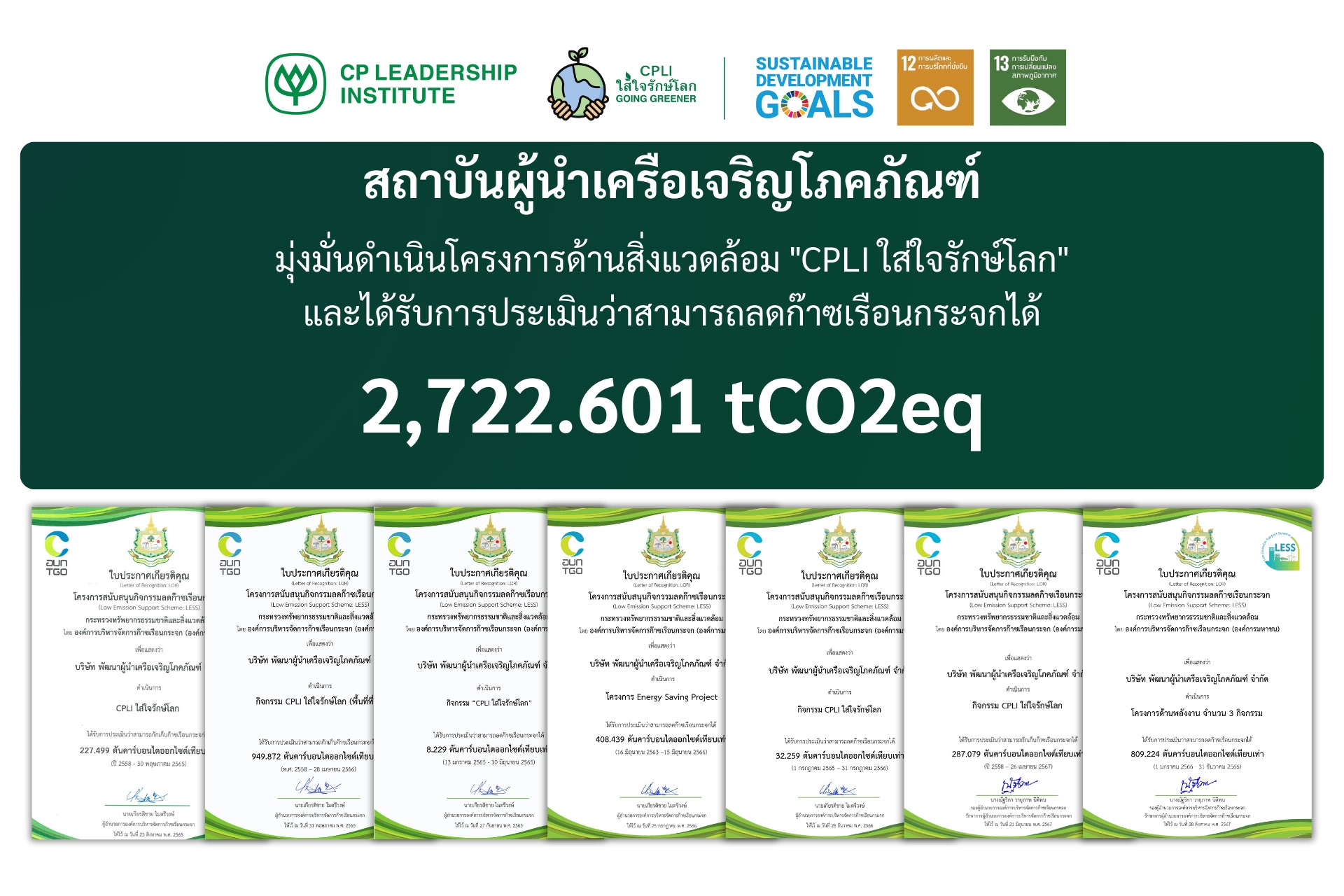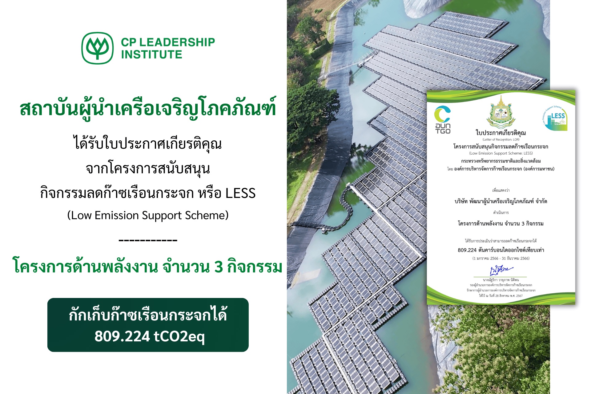 สถาบันผู้นำเครือเจริญโภคภัณฑ์ (CPLI) ได้รับใบประกาศเกียรติคุณโครงการสนับสนุนกิจกรรมลดก๊าซเรือนกระจก (LESS) จากองค์การบริหารจัดการก๊าซเรือนกระจก (อบก.) เป็นครั้งที่ 7 สำหรับโครงการ “Energy Saving Project” ที่สามารถลดก๊าซเรือนกระจกได้ถึง 809.224 ตันคาร์บอนไดออกไซด์เทียบเท่า โดยโครงการนี้ประกอบด้วยกิจกรรมด้านการเพิ่มประสิทธิภาพพลังงานและพลังงานทดแทน ได้แก่ :
