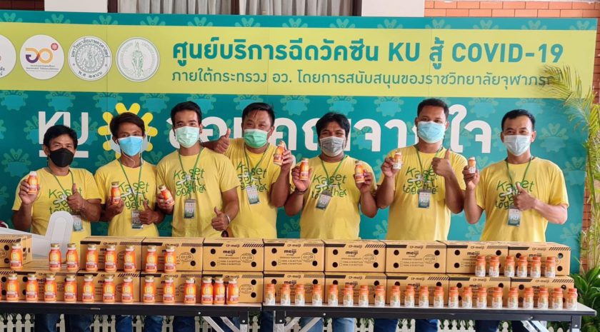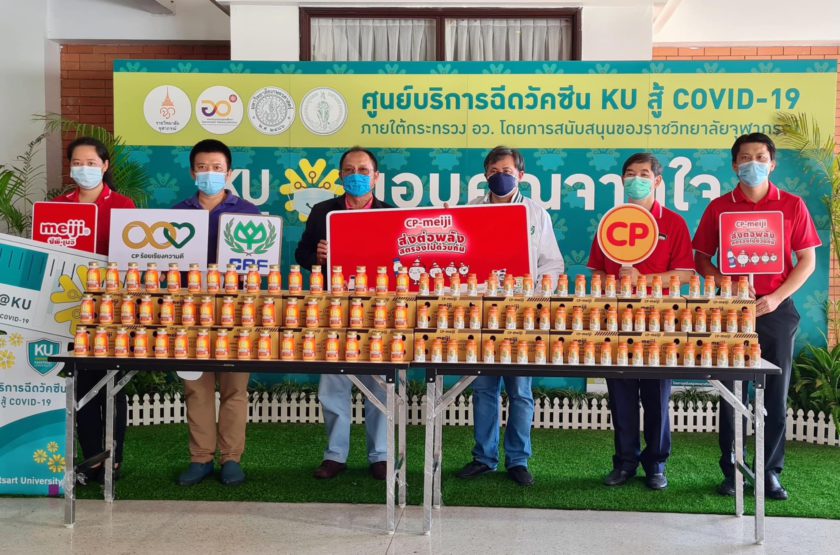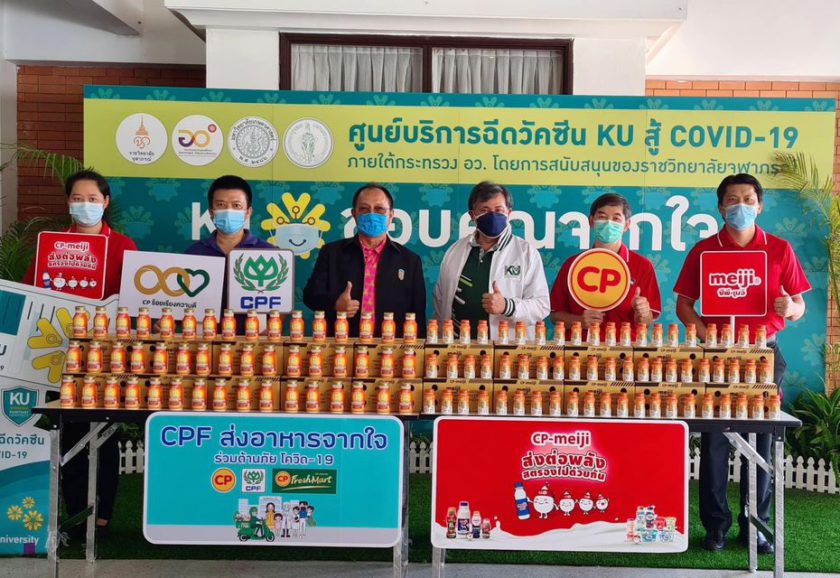 ดร.ดำรงค์ ศรีพระราม รองอธิการบดีฝ่ายบริหาร มหาวิทยาลัยเกษตรศาสตร์ รับมอบผลิตภัณฑ์นมพาสเจอร์ไรส์ B-Complex และโยเกิร์ตพร้อมดื่ม PRO-C จำนวน 7,000 ขวด มูลค่า 103,000 บาท จาก ซีพี – เมจิ ภายใต้โครงการ “CPF ส่งอาหารจากใจ ร่วมต้านภัยโควิด-19” ตามนโยบายเครือเจริญโภคภัณฑ์ เพื่อเป็นกำลังใจแก่ทีมแพทย์ พยาบาล เจ้าหน้าที่ ตลอดจนอาสาสมัคร ในการปฎิบัติหน้าที่ด้วยความเสียสละในการฉีดวัคซีนป้องกันโควิดให้แก่ประชาชนราว 10,000 คนต่อวัน เพื่อเป็นส่วนหนึ่งในการร่วมสร้างภูมิคุ้มกันหมู่ให้แก่ประเทศไทย ณ ศูนย์ฉีดวัคซีน KU สู้ COVID-19 มหาวิทยาลัยเกษตรศาสตร์ บางเขน โดยมี น.สพ.ปราโมทย์ ตาฬวัฒน์ กรรมการสภาอุตสาหกรรมแห่งประเทศไทย และคุณเลิศเกียรติ พูลผล ผู้ช่วยกรรมการผู้จัดการ ซีพี-เมจิ เป็นผู้แทนบริษัทฯ มอบ
