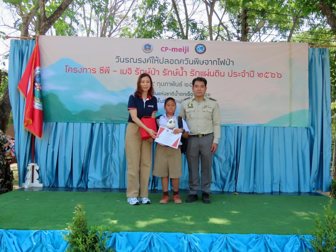 ด้าน คุณชาลินี พูนลาภมงคล กล่าวว่า ซีพี-เมจิ ให้ความสำคัญกับการพัฒนาความยั่งยืนโดยเฉพาะด้านสิ่งแวดล้อม จึงร่วมมือกับกรมอุทยานแห่งชาติฯ ปลูกต้นไม้เพิ่มพื้นที่สีเขียว รวมทั้งมอบอุปกรณ์ป้องกันและดับไฟป่าอย่างต่อเนื่อง ในครั้งนี้ ชาวซีพี-เมจิ จิตอาสา ลงพื้นที่มอบอุปกรณ์ต่างๆ จำนวน 16 รายการ อาทิ ถังฉีดน้ำ ไม้ตบไฟ ครอบ เครื่องเป่าลมเป่าใบไม้ชนิดเครื่องยนต์พร้อมอุปกรณ์เสริม เครื่องตัดหญ้า กล้องติดหมวกสำหรับบันทึกภาพ พร้อมด้วยนมเมจิคุณภาพ เสริมพลังกายเติมกำลังใจสำหรับเจ้าหน้าที่และอาสาสมัคร