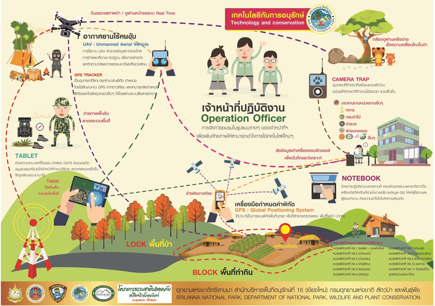 “โครงการธรรมชาติปลอดภัย เข้าไปช่วยเหลือตั้งแต่ปี 2555 โดยนำระบบเทคโนโลยีเข้าไปช่วยในการโอบล้อมป่า เริ่มต้นด้วย เครื่อง GPS ในการตรวจจับพื้นที่ดิน สนับสนุนเครื่องคอมพิวเตอร์ ให้มีการเก็บข้อมูลไว้ ต่อมาก็มีการสนับสนุนเรื่องของ Tablet ซึ่งดีกว่า GPS เพราะว่า Tablet สามารถถ่ายรูปและก็เก็บข้อมูลได้เป็นอย่างดี สุดท้าพัฒนามาเป็นโดรน ซึ่งโดรนจะช่วยในเรื่องของการลาดตระเวน การดูพื้นที่การบุกรุก สิ่งสำคัญอันดับสุดท้ายคือ โครงการธรรมชาติปลอดภัยสนับสนุนให้มีการสร้าง War Room เป็นสถานที่ที่รวบรวมข้อมูลทั้งหมด และส่งผ่านข้อมูลนี้ไปยังหน่วยงานต่างๆ หน่วยป้องกันต่างในพื้นที่ จังหวัด กรมอุทยานสัตว์ป่าและพันธุ์พืชที่กรุงเทพ ซึ่งเป็น War Room แห่งแรกของภาคเหนือที่ทำให้กับอุทยานแห่งชาติศรีล้านนา เพื่อในการดูแลรักษาป่า ไฟป่า และคนกับป่า” คุณจงกล เล่าถึงลำดับการสนับสนุนเครื่องมือช่วยเหลือ