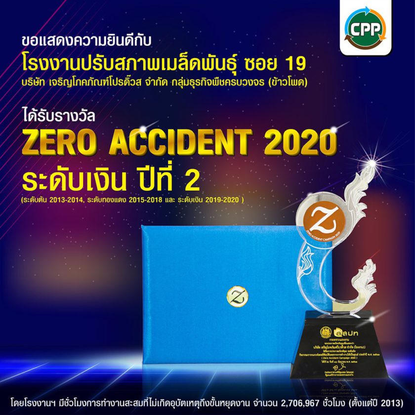 ขอแสดงความยินดีกับ โรงงานปรับสภาพเมล็ดพันธุ์ ซอย 19 บริษัท เจริญโภคภัณฑ์โปรดิ๊วส จำกัด กลุ่มธุรกิจพืชครบวงจร (ข้าวโพด) ที่ได้รับรางวัล Zero Accident Campaign 2020 : กิจกรรมการรณรงค์ลดสถิติอุบัติเหตุจากการทำงานให้เป็นศูนย์ ระดับเงิน ปีที่ 2 จากสถาบันส่งเสริมความปลอดภัย อาชีวอนามัย และสภาพแวดล้อมในการทำงาน (องค์การมหาชน) โดยได้รับรางวัลต่อเนื่อง ตั้งแต่ปี 2556