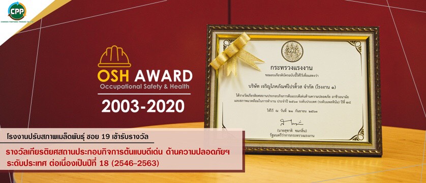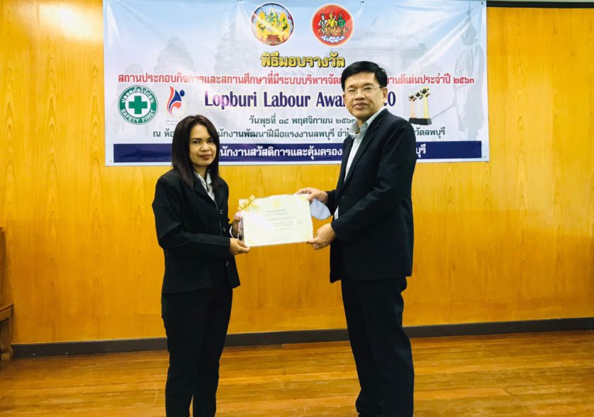 คุณพิมพ์ใจ คำพลึก ตัวแทนผู้บริหารโรงงานปรับสภาพเมล็ดพันธุ์ ซอย 19 บริษัท เจริญโภคภัณฑ์โปรดิ๊วส จำกัด กลุ่มธุรกิจพืชครบวงจร (ข้าวโพด) เข้ารับ “รางวัลสถานประกอบกิจการต้นแบบดีเด่นด้านความปลอดภัย อาชีวอนามัย และสภาพแวดล้อมในการทำงาน ระดับประเทศ (ระดับแพลทินั่ม) ประจำปี 2563 ต่อเนื่องเป็นปีที่ 18 (ปี 2546-2563)” จากคุณวชิระ เกตุพันธุ์ รองผู้ว่าราชการจังหวัดลพบุรี ณ สำนักงานพัฒนาฝีมือแรงงานลพบุรี อ.เมือง จ.ลพบุรี